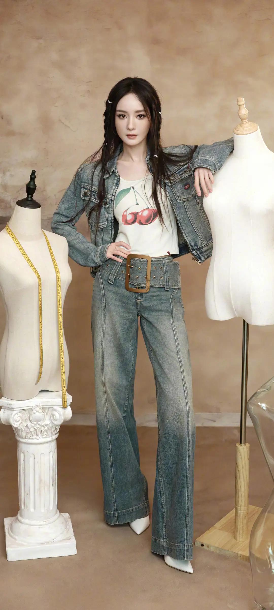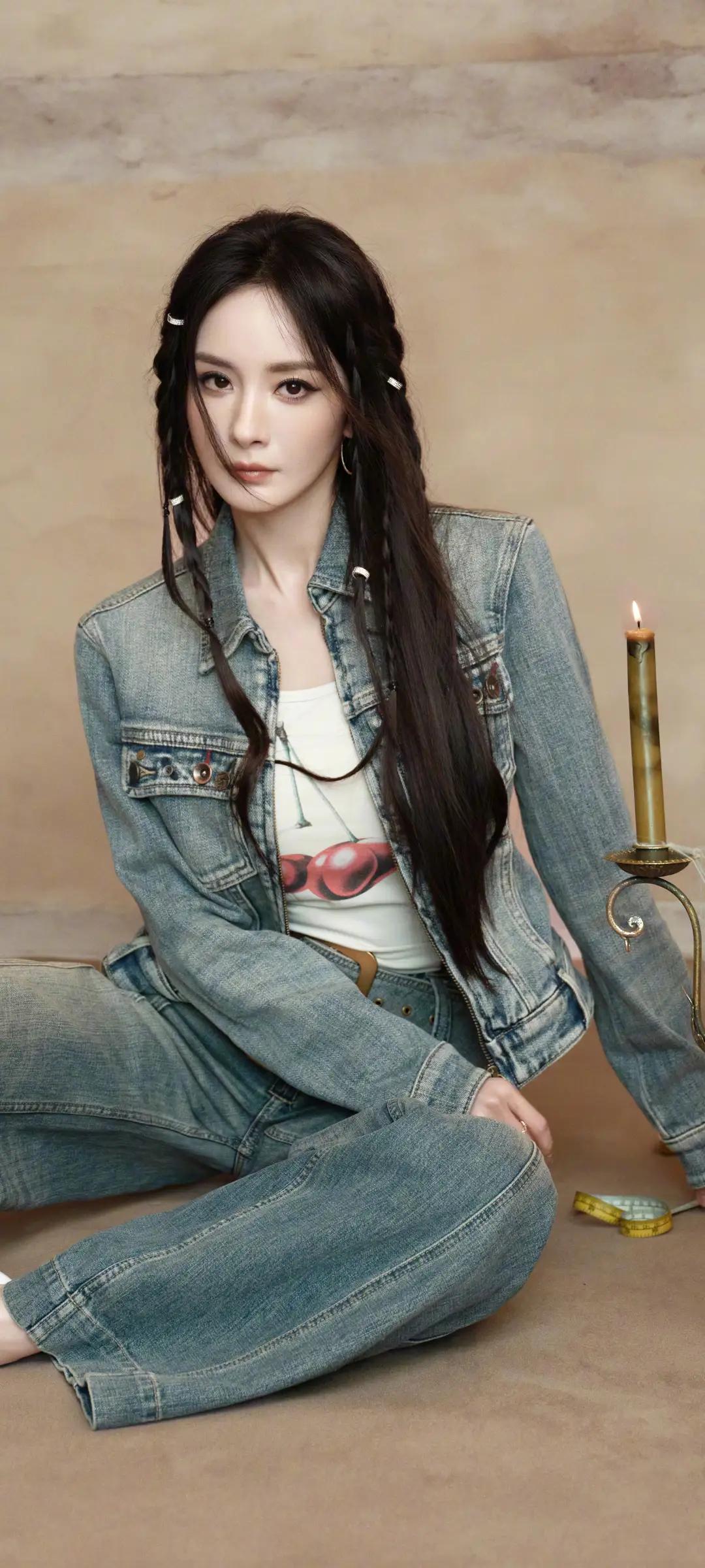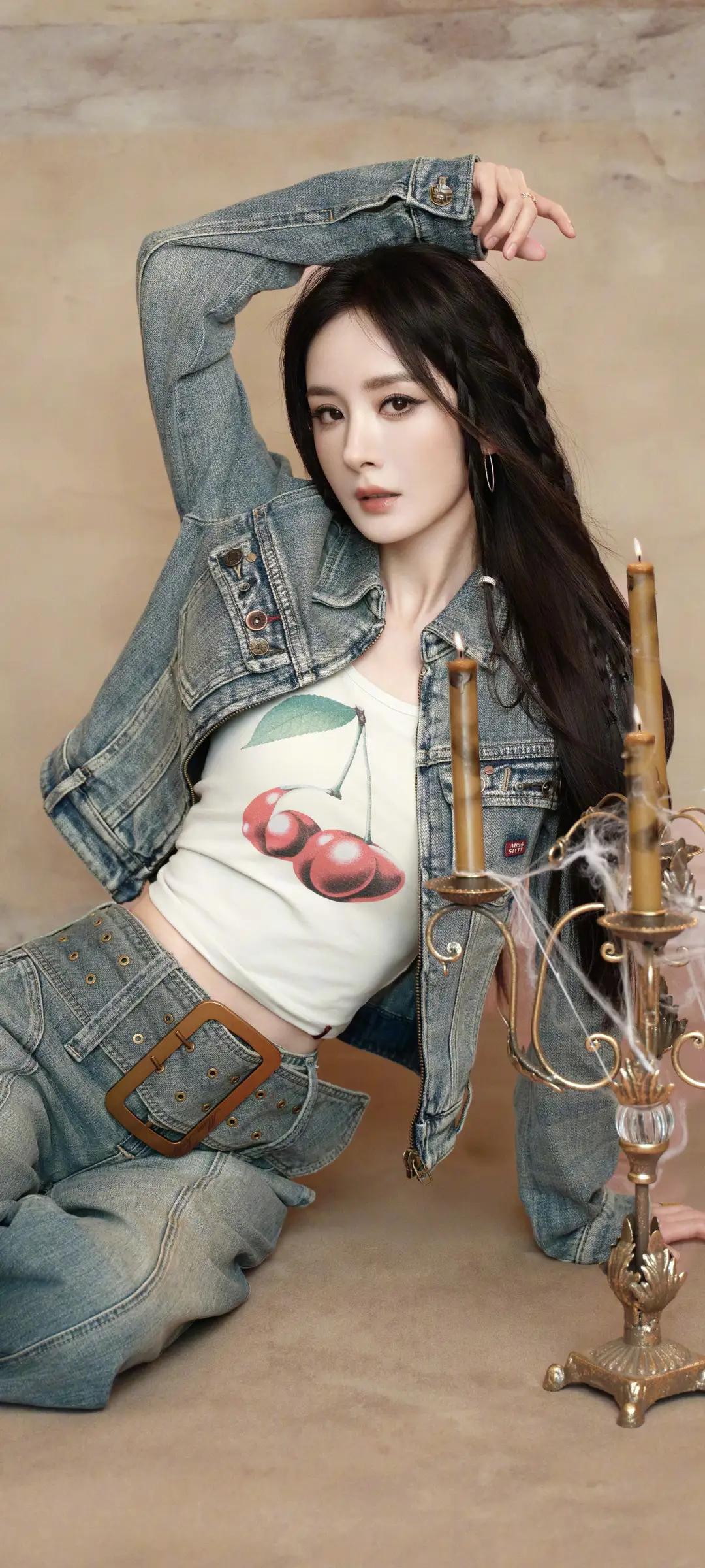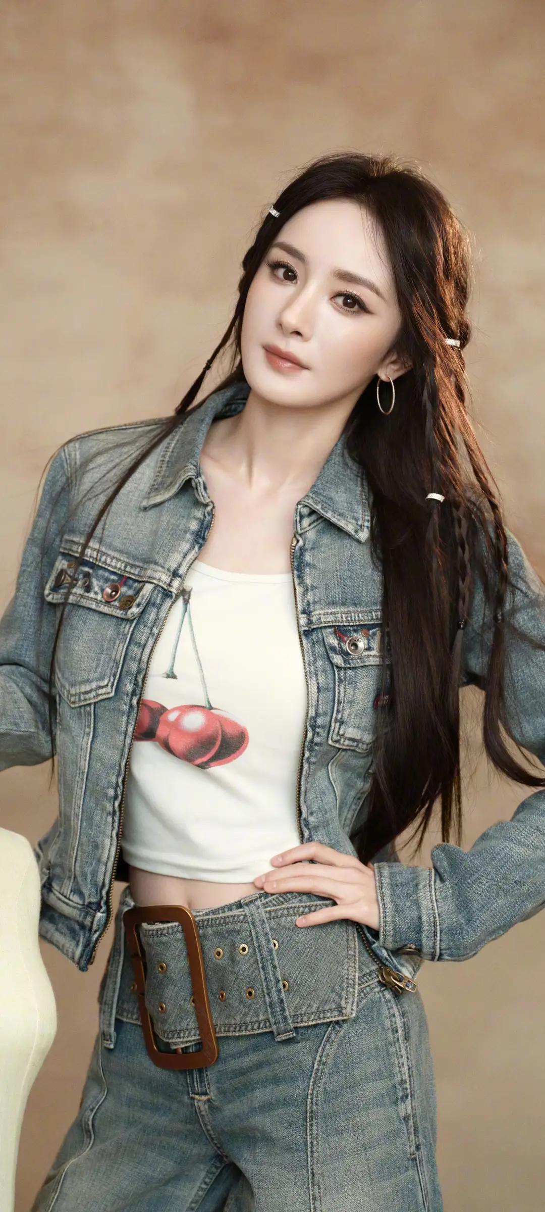 美女壁纸~杨幂,甜酷牛仔风,复古又时髦!樱桃印花内搭搭配做旧牛仔套装,慵懒编发随性又灵动,又甜又飒,气场全开