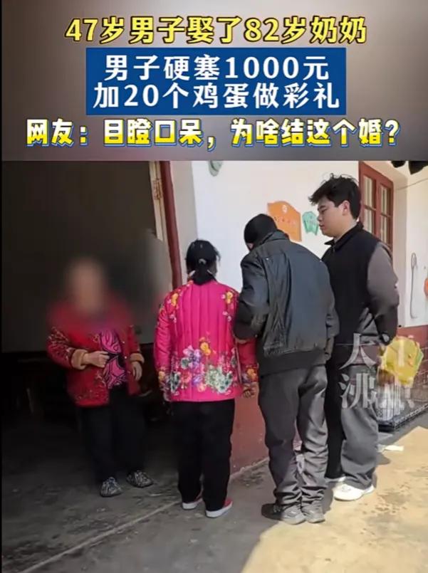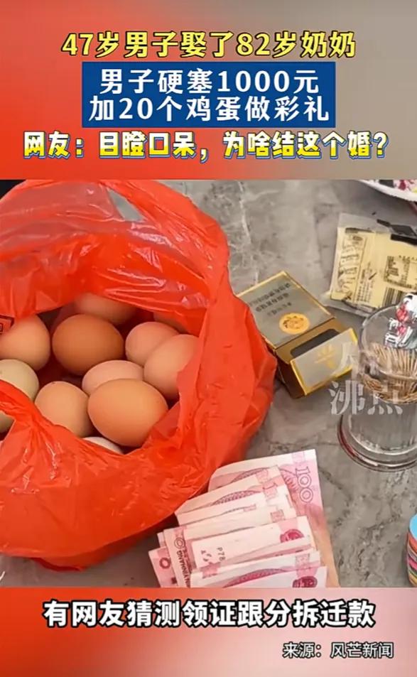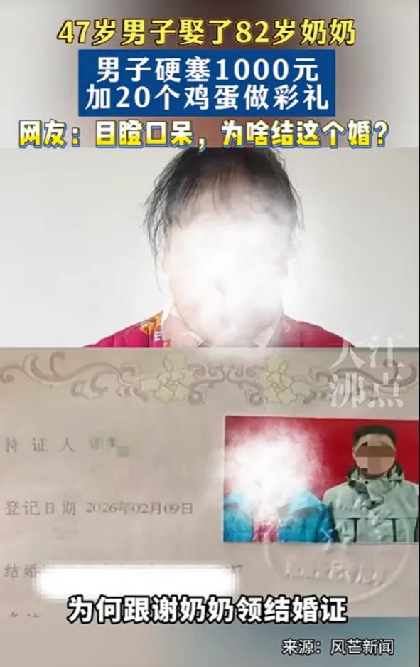 万万没想到!湖南湘潭,一47岁男子娶了82岁奶奶,男子硬塞1000元加20个鸡蛋做彩礼,网友:目瞪口呆,为啥结这个婚? 这事要从2026年2月9日说起,湘潭这位谭姓男子,拿着1000块现金和一塑料袋20个鸡蛋,找到82岁的谢奶奶,说要跟她领证结婚。谢奶奶不识字,脑子也有些糊涂,以为只是走个过场的“假结婚”,稀里糊涂就跟着男子去了民政局,两人顺利领回了结婚证。 男子怕婚事黄了,还特意把彩礼往谢奶奶手里硬塞,谢奶奶推都推不掉。男方母亲一开始还拒收这份寒酸的彩礼,大概也觉得这事太离谱,怕被村里人戳脊梁骨,可架不住儿子执意要办,最后也只能默认。 纸终究包不住火。3月11日,谢奶奶的儿子和孙子偶然得知了这件事,气得带着老人直接冲到男方家质问。面对家属的怒火,谭姓男子躲着不敢露面,只让他母亲出来应付,嘴硬说“这桩婚事是你奶奶自己同意的”。可谢奶奶却哭着说,她根本不知道这是真结婚,还以为只是帮个忙走个流程,连对方到底想干嘛都不清楚。 消息一曝光,网上直接炸了锅。大家盯着那1000块和20个鸡蛋的彩礼,越看越觉得不对劲,这点钱连顿像样的饭都请不起,哪像是正经娶亲的样子?更多人把矛头指向了背后的利益,当地有传言说村子要按户口人头分拆迁补偿,不少人猜测,男子就是冲着谢奶奶的那份补偿款来的,想借着婚姻的名义分一笔钱,甚至霸占老人的房子和养老待遇。 我们常说婚姻自由,可自由的前提是双方都有足够的认知和判断能力。当一方是年事已高、可能缺乏自保能力的老人,所谓的“自愿”就需要打个大大的问号。这件事里,所谓的“爱情”更像一层遮羞布,底下藏着的是对老人财产的算计,是对规则的钻空子,更是对弱势者的欺凌。 大家愤怒的不是年龄差,是怕有人把婚姻当成牟利的工具,把老人当成待宰的羔羊。如果连这种明显不对劲的结合都能被一句“流程合规”轻轻带过,那以后还会有多少老人被算计?这才是这件事给所有人敲响的警钟。 各位读者你们怎么看?欢迎在评论区讨论。