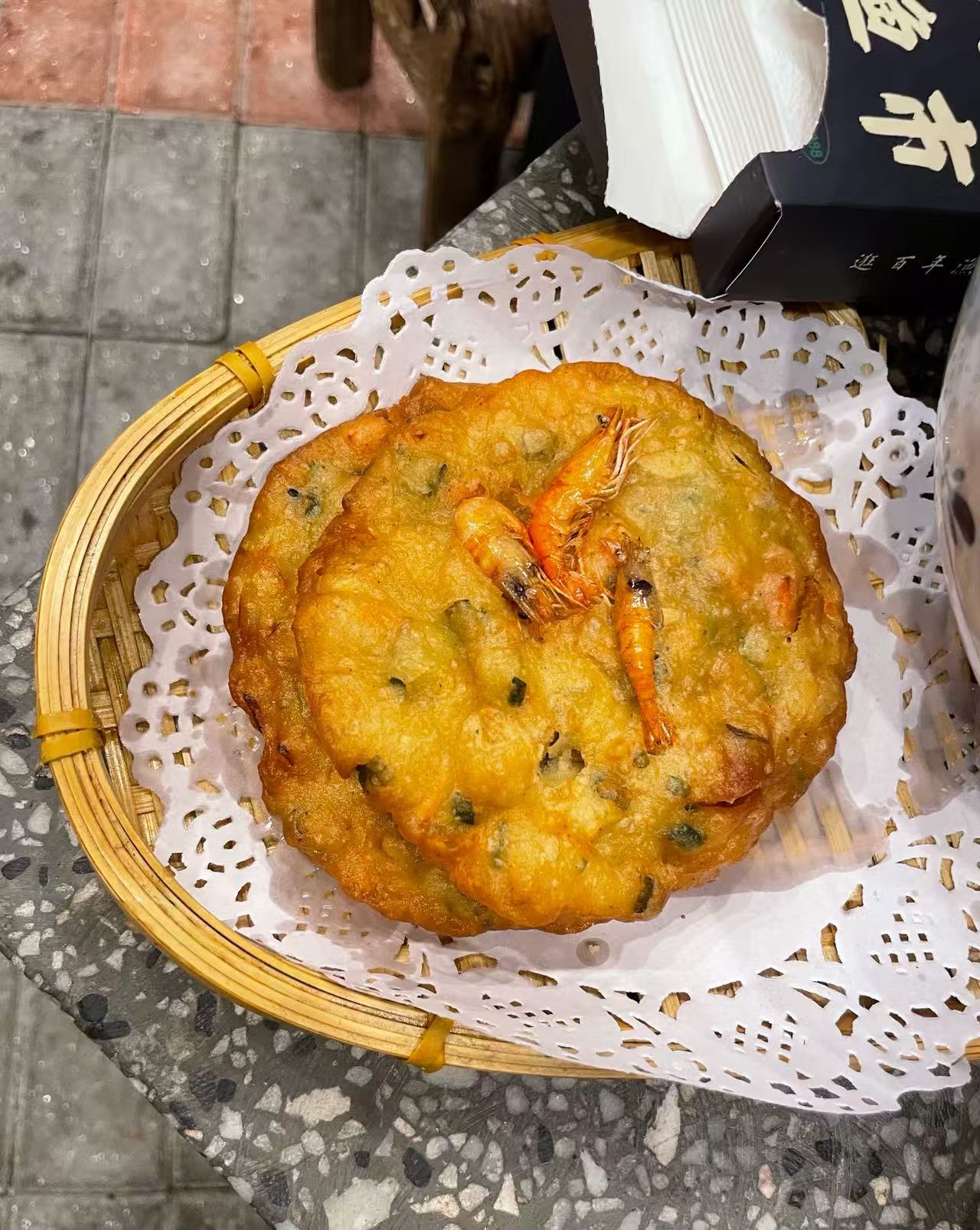 2️⃣.现炸虾饼,外酥里嫩,虾肉饱满,刚出锅咔嚓脆,咸香十足