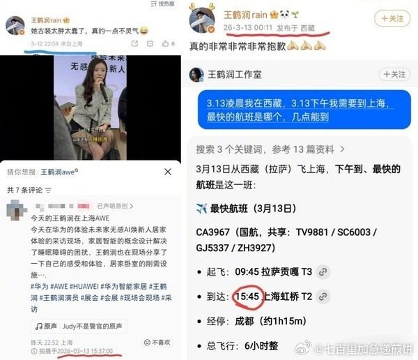 王鹤润点评王玉雯古装不好看还有后续,之前因为说她本人在西藏,但是点评的ip在上海,说估计不是本人,现在网友拉的时间线: