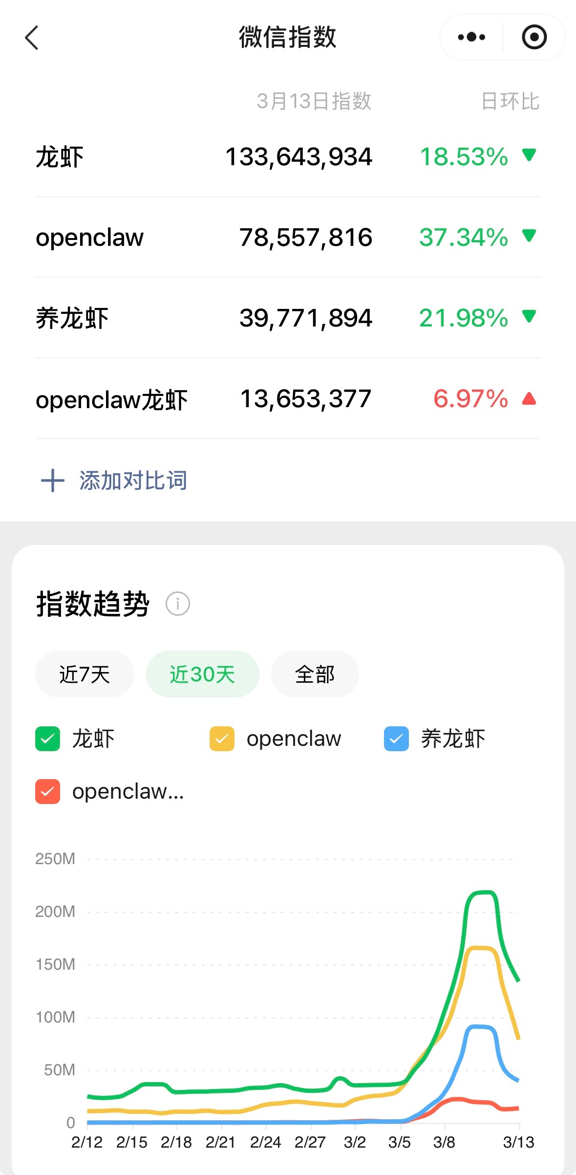 龙虾在3 月 5、6 日起势,就是腾讯云地推安装的时间节点, 3 月 10、11 日见顶,12、13 日迅速回落。