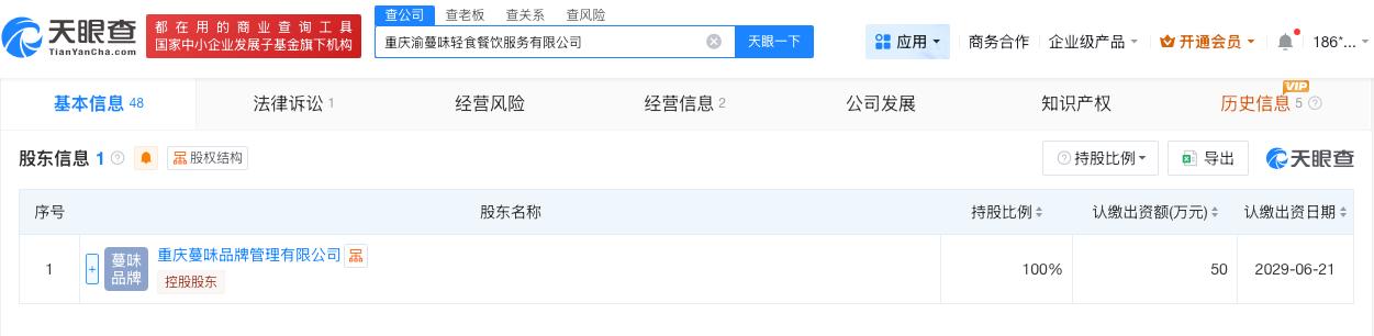蔓味轻食关联公司成立不足2年 蔓味轻食关联公司揭秘连锁轻食店员感冒边擦鼻涕边切菜 据报道,近日,记者卧底发现蔓味轻食、谨食、超模厨房等知名轻食连锁店后厨存在卫生隐患,引发关注。 天眼查App显示,蔓味轻食关联公司重庆渝蔓味轻食餐饮服务有限公司成立于2024年6月,法定代表人为蒋霞,注册资本50万人民币,经营范围包括餐饮服务、食品销售、品牌管理、餐饮管理等,由重庆蔓味品牌管理有限公司全资持股。 天眼查信息: