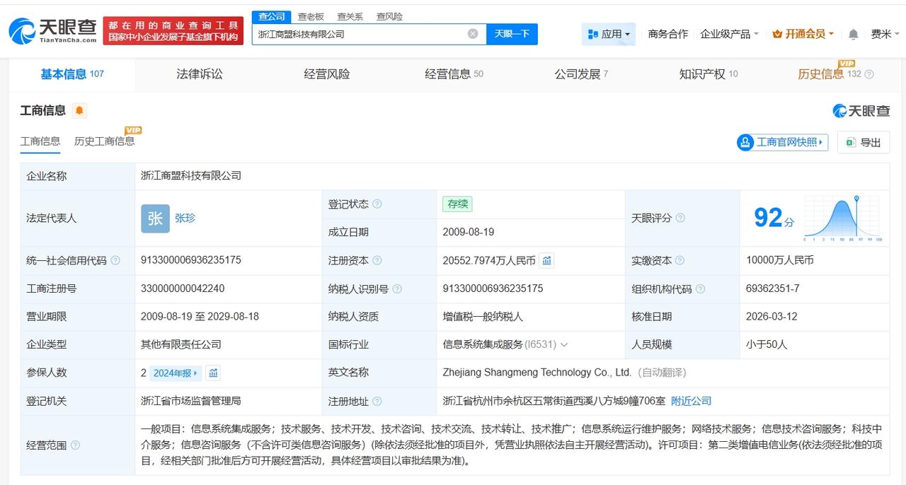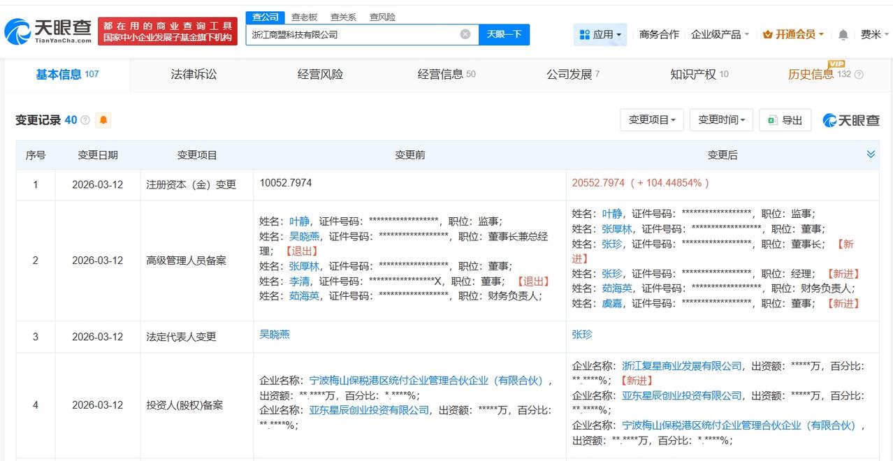 复星集团旗下商盟科技增资至约2.1亿 复星集团入股商盟科技完成工商变更 天眼查工商信息显示,近日,浙江商盟科技有限公司发生工商变更,新增复星集团旗下浙江复星商业发展有限公司为股东,注册资本由约1亿人民币增至约2.1亿人民币,增幅约104%,吴晓燕卸任法定代表人、董事长兼总经理,张珍接任法定代表人、董事长、经理。 浙江商盟科技有限公司成立于2009年8月,经营范围包括信息系统集成服务、信息系统运行维护服务、网络技术服务等。股东信息显示,该公司现由亚东星辰创业投资有限公司、宁波梅山保税港区统付企业管理合伙企业(有限合伙)及上述新增股东共同持股。 据媒体报道,此前复星国际发布公告称,其拟以现金1.05亿元认购商盟科技新增注册资本,成为商盟科技的最大股东。 天眼查信息: