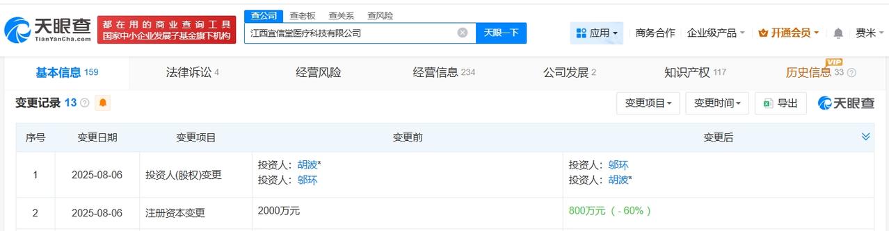 起底贴牌修正药业涉事公司 贴牌修正药业涉事公司去年减资花1.5万就能用修正商标卖自家产品 据媒体报道,近日,花1.5万就能用修正商标卖自家产品的问题被曝光,多家企业被点名。 天眼查App显示,涉事公司江西宜信堂医疗科技有限公司成立于2010年11月,法定代表人为胡波,经营范围包括第二类医疗器械生产、第三类医疗器械租赁、第三类医疗器械经营等。股东信息显示,该公司由胡波、邬环共同持股。变更记录显示,去年8月,该公司注册资本由2000万人民币减至800万人民币。 山东凝善堂生物科技有限公司成立于2022年3月,法定代表人为高杰,注册资本1000万人民币,经营范围包括生物质能技术服务、化妆品零售、专用化学产品销售等,由山东凝善堂药业有限公司、山东聊城傅制胶生物科技有限公司、济南康利斯咨询服务有限公司共同持股。 河南草本世家生物科技有限公司成立于2018年5月,法定代表人为王长青,注册资本500万人民币,经营范围包括市场营销策划、会议服务、展览展示服务等,由王长青、齐辉共同持股。 天眼查信息: