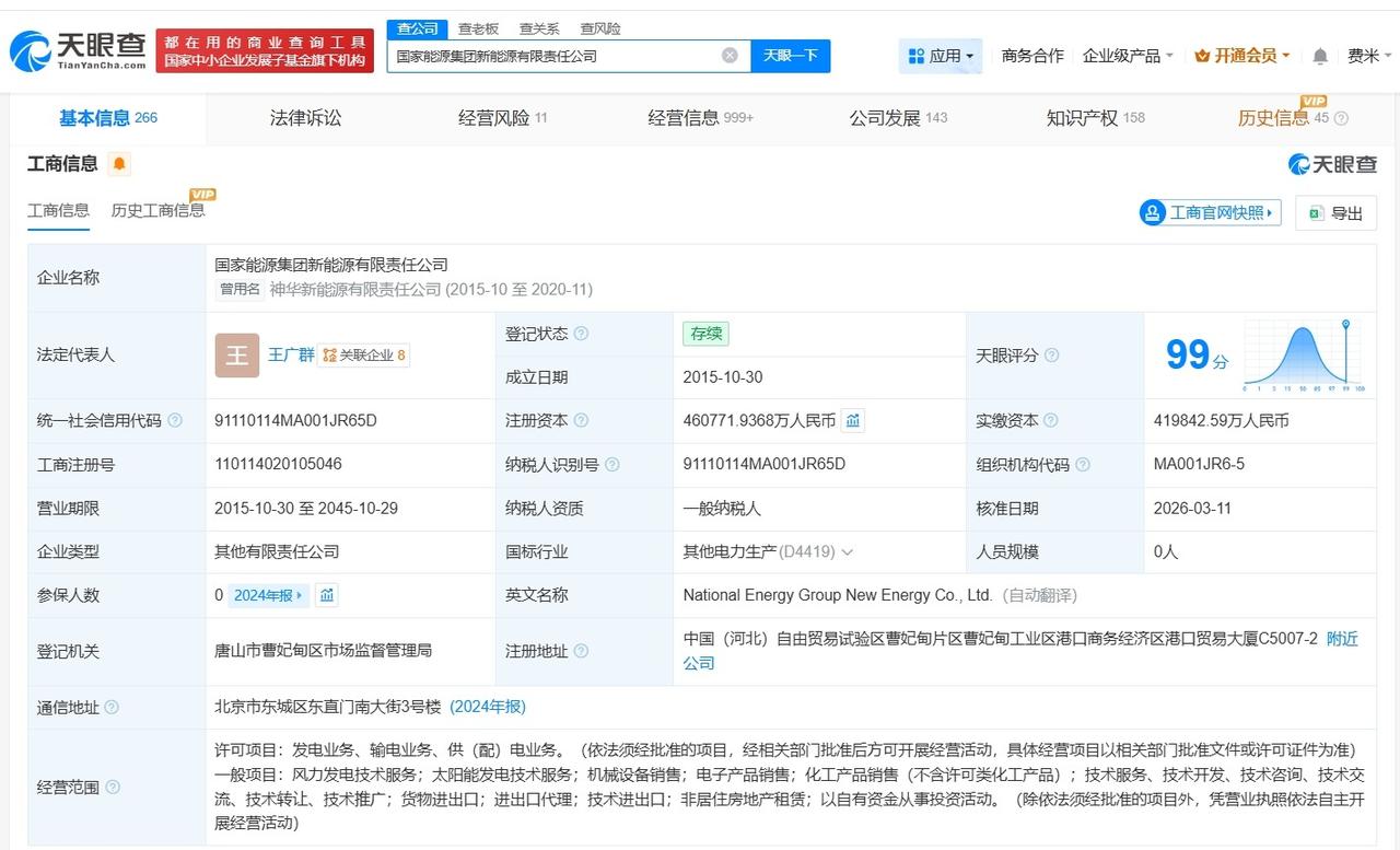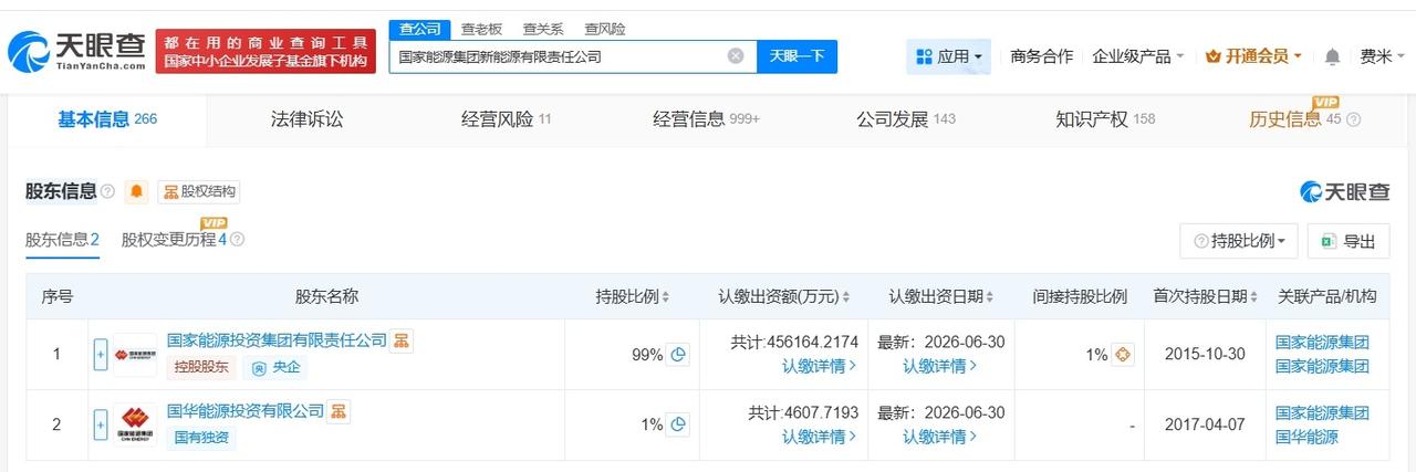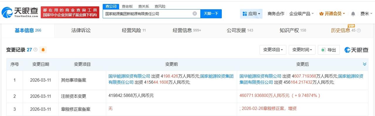 国家能源集团新能源公司增资至46.1亿 增幅约10% 天眼查App显示,近日,国家能源集团新能源有限责任公司发生工商变更,注册资本由约42亿人民币增至约46.1亿人民币,增幅约10%。 国家能源集团新能源有限责任公司成立于2015年10月,法定代表人为王广群,经营范围包括发电业务、风力发电技术服务、太阳能发电技术服务等。股东信息显示,该公司由国家能源投资集团有限责任公司、国华能源投资有限公司共同持股。 天眼查信息: