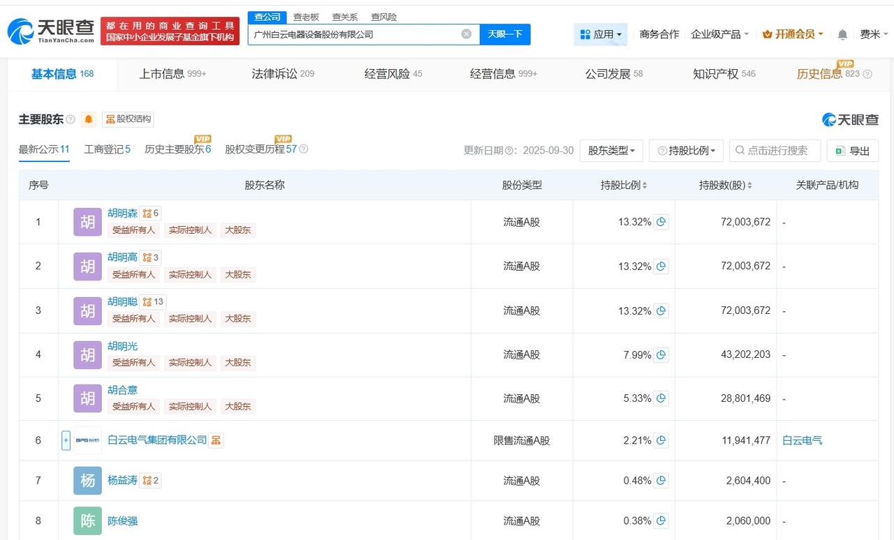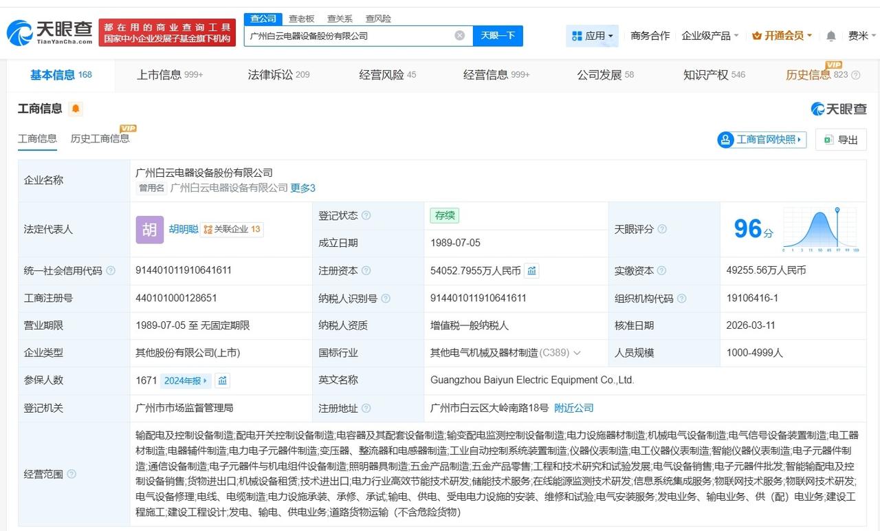 白云电器增资至约5.4亿 胡明聪任白云电器法定代表人 天眼查App显示,近日,白云电器(603861)发生工商变更,胡德兆卸任法定代表人,由胡明聪接任,同时,注册资本由约4.9亿人民币增至约5.4亿人民币,增幅约10%。 广州白云电器设备股份有限公司成立于1989年7月,经营范围包括输配电及控制设备制造、配电开关控制设备制造、电力设施器材制造等。股东信息显示,该公司由胡明森、胡明高、胡明聪等共同持股。 天眼查信息: