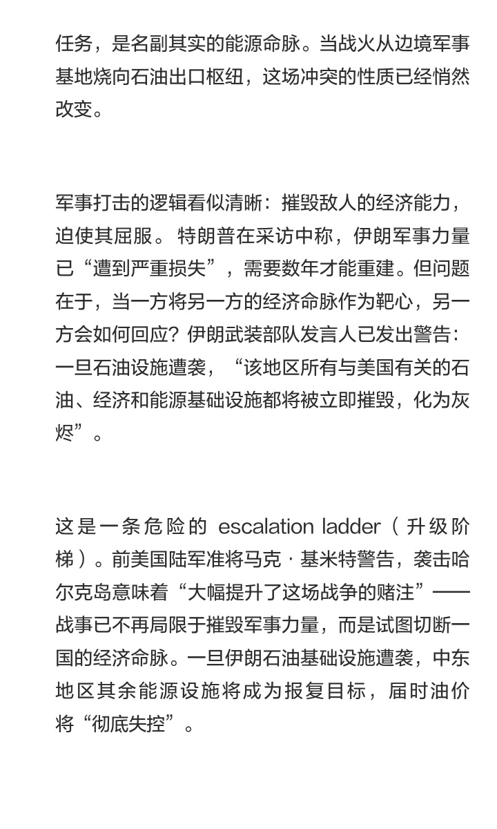 前美国陆军准将马克·基米特警告,袭击哈尔克岛意味着“大幅提升了这场战争的赌注”——战事已不再局限于摧毁军事力量,而是试图切断一国的经济命脉。一旦伊朗石油基础设施遭袭,中东地区其余能源设施将成为报复目标,届时油价将“彻底失控”。