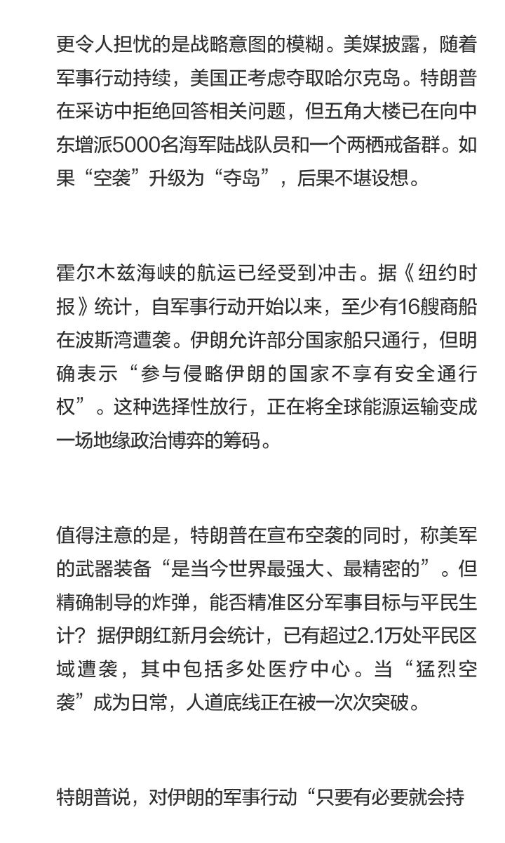特朗普说,对伊朗的军事行动“只要有必要就会持续”。但我们需要追问:什么是“必要”?摧毁石油出口枢纽是“必要”,还是将能源命脉作为人质是“必要”?当“必要”的定义权掌握在发动空袭的一方手中,和平的空间只会越来越窄。