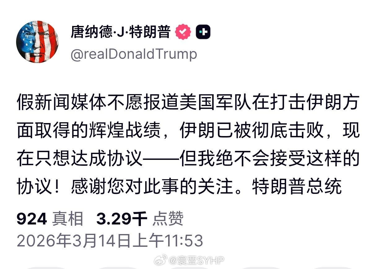 特朗普又自称赢了特朗普发文:假新闻媒体不愿报道美国军队在打击伊朗方面取得的辉煌战绩,伊朗已被彻底击败,现在只想达成协议——但我绝不会接受这样的协议!