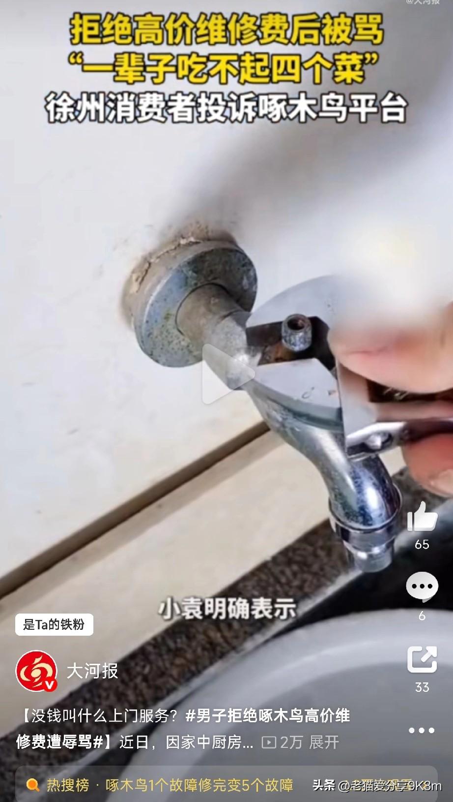 拒绝高价维修费竟遭辱骂? 徐州的男子小袁因厨房水龙头漏水,自己买了材料后预约某某鸟上门安装。 师傅上门报价250元,优惠后220元。小袁觉得太贵拒绝,结果师傅转身就走,2分钟后又回来敲门,还骂人:“没钱你点什么上门维修啊?你这辈子四个菜吃不上!” 这波操作直接把小袁气炸,拒绝服务还被侮辱人格,简直离谱! 小袁明确表示:拒绝高价不等于“没钱”,更不该被骂!他向平台和监管部门投诉后,某鸟客服道歉并送30元优惠券,结果小袁怒怼:“优惠券你自己留着吧!以后再也不用了!” 更让人无语的是,徐州鼓楼区市监局坦言:某鸟投诉很多但难监管,因为平台注册在重庆,本地管不着。而且维修师傅“良莠不齐”,培训一两周就上岗,价格还是市场自主定价…… 工作人员甚至建议被骂直接报警:“摁着他不让走!” “维修刺客”防不胜防:报价虚高、坐地起价,拒绝就翻脸,甚至人身攻击! 平台责任难甩锅:师傅素质差、培训草率,出事就推给“个人行为”? 消费者维权难:异地注册、监管真空,投诉可能石沉大海。 建议大家 预约前问清价格明细,避免“到店加价”! 保留聊天记录、录音等证据,维权时备用。 遇辱骂或威胁,直接报警或12315投诉,别忍气吞声! 支持小袁维权!必须曝光这种无良平台! 说句实话:做服务,靠的是手艺和诚信,价格虚高可以谈,但骂人侮辱就是人品问题! 平台如果只管收钱不管人,迟早砸自己招牌! (文章素材来自大河报,侵删)