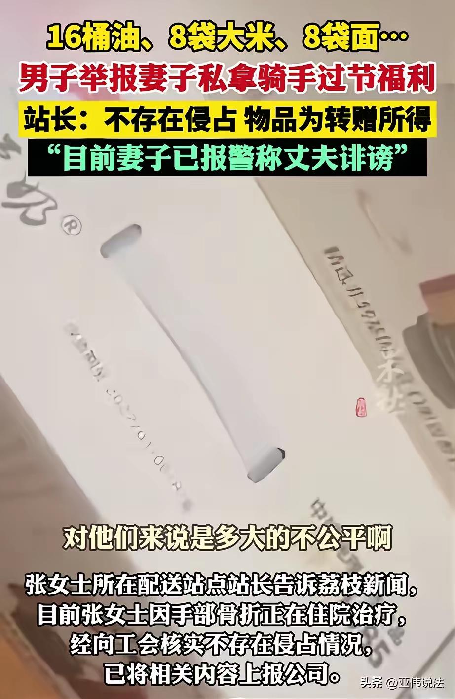 这件事确实涉及多个层面的问题,反映了亲情、职场伦理和法律边界的复杂纠葛。以下是对事件的几点分析和解读: 事实层面 女子张女士作为配送站点副站长,疑似私自将单位本应发放给骑手的过节福利物资(16桶油、8袋大米、8袋面)转移到自己家中。 丈夫金先生得知后,认为妻子利用职务便利侵犯集体利益,选择举报。 配送站长和公司方面回应称物资是领导间的转赠,目前没有确凿证据证明张女士侵占。 张女士反诉丈夫诽谤,夫妻关系因此激化。 法律层面 根据《刑法》第271条,单位工作人员利用职务便利非法占有本单位财物,若数额较大,可能构成职务侵占罪,面临刑事处罚。 如果数额未达到刑事标准,由相关单位依规追责也属合理。 关键在于判断张女士是否真的“非法占有”,还是“合理接收”其它领导转赠的物资,这需要明确证据。 道德伦理层面 作为副站长,理应以身作则,维护组织和员工的利益,私自将集体福利带回家,确实损害公平与信任。 金先生选择举报妻子,表面看似“义正辞严”,但也反映出家庭矛盾和夫妻间信任的破裂。 如何在家庭与公义之间取得平衡,是这对夫妻乃至社会面临的难题。 舆论和社会反响 公众普遍赞扬金先生的正直,同时也有声音质疑站长与副站长之间的人际关系,反映出对权力关系的敏感。 此事件引发的讨论,反映了普通人对职场公平和家庭伦理的关切。 建议和展望 该事件需由单位和相关监管部门依法调查,厘清事实真相,查明物资流向和所有权。 在确保事实清楚、证据确凿情况下,做出相应法律和管理处理,防止类似事件发生。 同时关注夫妻双方的沟通与调解,避免家庭关系恶化成不可挽回的局面。 整个事件也是对基层单位福利管理和监督机制的提醒,应加强规范,防止物资流失。 总之,这件事情表面是职权与私欲的冲突,但背后更涉及家庭关系和基层管理的复杂问题,最终真相还需通过客观调查来判定。无论如何,公平公正的处理流程和对人性的理解都不可或缺。法律外的人情 职场道德争议