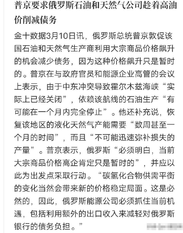 普京是真的清醒,面对最近一路飙升的国际油价,没有跟着盲目乐观,反而第一时间给俄罗斯的能源公司敲了警钟,明确要求他们趁着现在的高油价,赶紧削减债务,把过去几年欠下的账都还上。 大家怎么看,一起评论区唠唠! 趁着油价飙升疯狂还债?咱一起来看看普京这波“反向操作”的顶级阳谋,要说普京是真的清醒,他明确要求这些巨头,趁着现在的高油价,赶紧削减债务,把过去几年欠下的陈年老账全都还上,这波操作让不少想看热闹的人直接傻了眼,原本以为他要趁火打劫,结果人家在家里忙着“大扫除”。 这几天的国际油价确实疯了,受中东那边叮里咣当一顿乱打的影响,最高时一桶油冲到了119美元,这时候美国也撑不住了,捏着鼻子解除了对俄罗斯石油的禁令,全世界的订单像雪片一样飞向克里姆林宫。 按说这时候,俄油、俄气这些大老板该开香槟庆祝了,毕竟兜里的现金流从来没这么厚实过,可普京这盆冷水泼得那叫一个干脆,直接在会上放话:一分钱不许乱花,先把那快十万亿卢布的债务窟窿给我堵上。 普京这账算得太精了,他一眼就看穿了这波暴涨背后的虚火,这种靠地缘冲突、海峡封锁撑起来的高油价,纯属“意外之财”,撑死也就维持个一两个月,一旦战火稍微熄点,油价摔下来比坐电梯还快。 事实证明,姜还是老的辣,3月10号油价就玩了个高台跳水,直接跌回了80多美元,如果这时候还没把手里的现金换成债权,等油价回落,那些沉重的利息能直接把能源公司的脊梁骨给压断。 普京这是在吸取血的教训,2014年和2020年,俄罗斯两次在油价暴跌上栽过大跟头,那时候卢布贬值、外汇缩水,能源巨头们差点因为资金链断裂集体“躺平”,他绝不允许同样的坑再踩第三次。 现在趁着手里有钱,先把身上的“沙袋”解了,这叫轻装上阵,网友调解得好:“别人都在想怎么换豪车,普京却在想怎么把房贷提前还了,这才是过日子的顶级高手,” 更深层的用意,是他在为“向东转”的战略攒弹药,现在西方是指望不上了,俄罗斯要把能源往亚洲输送,修管道、建港口,哪样不要海量的真金白银?如果企业背着巨额债务,根本没人敢贷款给你搞新项目。 现在把债清了,信誉回来了,俄罗斯在亚太市场的布局就能跑出“推背感”,而且咱中国和俄罗斯的买卖用的是长期协议,不管外面油价怎么蹦迪,咱这边的基本盘稳如泰山,这是互利共赢的定海神针。 看着那些一有钱就挥霍、一没钱就破产的产油国,普京的定力确实让人佩服,他这是把天降的红利变成了抵御未来风险的防弹衣,不贪眼前的纸面富贵,只求长久的安稳运行。 说白了,普京这波“反向操作”就是最顶级的扫雷,把债务这颗雷排了,俄罗斯的能源大命脉才算真正进了保险箱,这盆冷水泼得不仅及时,更是泼出了大国掌舵者应有的格局和远见! 对此,大家有什么想说的呢?欢迎在评论区踊跃留言!麻烦看官老爷们阅读后点赞关注,谢谢! (个人观点,理性观看)