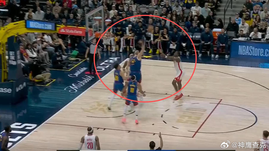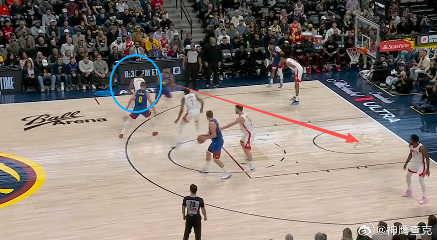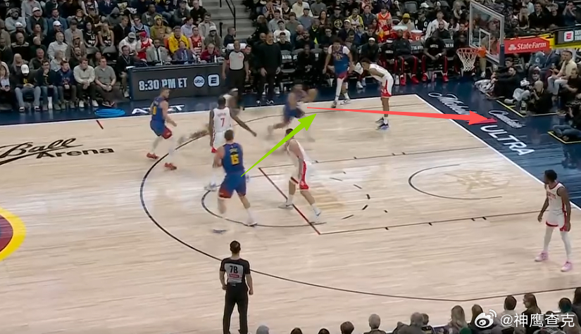 下面就跟随镜头,来逐帧拆解约基奇本赛季的精彩传球表现。1234约基奇肘区拿球发牌,默里左翼无球起手佯装,借布劳恩无球掩护上前发动”Middle Zoom“误导防守,随后在阿门汤普森准备挤过掩护的瞬间,立即拒绝掩护反跑空切篮下摆脱阿门,长驱直入如入无人之境,约基奇球领人精准制导,默里接球后面对空篮轻松单手扣进。