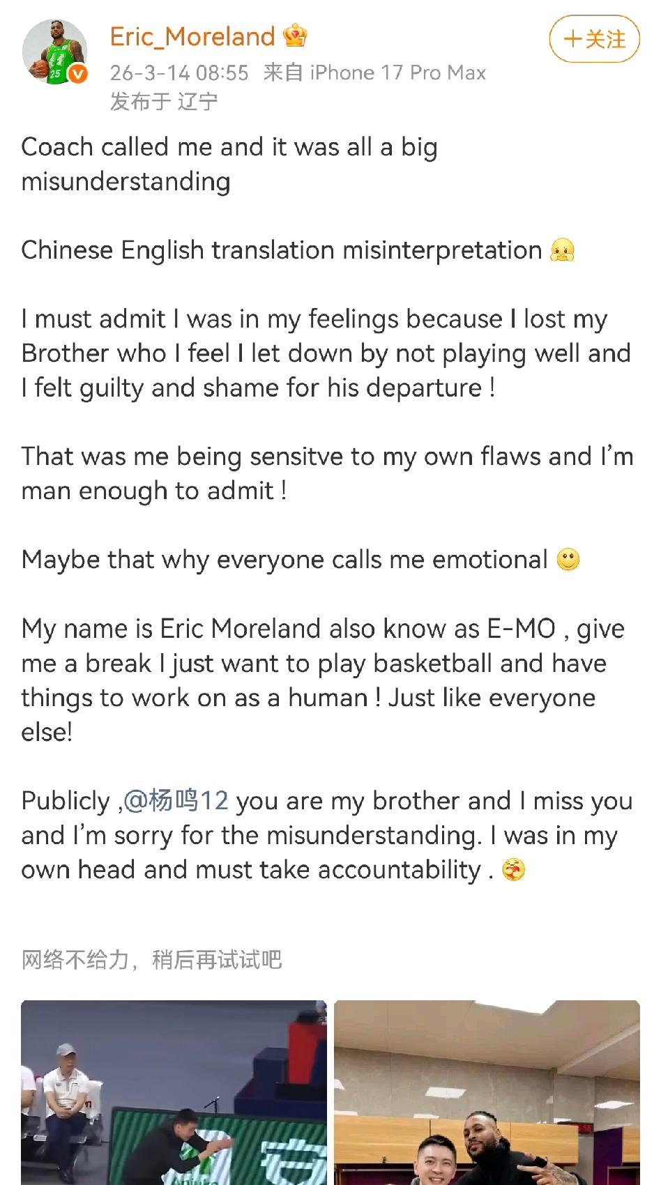 莫兰德深夜给杨鸣发信息,早上发社交媒体督促杨鸣给他打电话,不是因为杨鸣说他一大堆毛病破防,而是因为太在乎了。 这事是杨鸣做的不地道了,人家莫兰德对杨鸣一直当成师傅一样尊重,虽然摔过杨鸣的战术板,但也把杨鸣的照片当作头像非常喜欢他。 杨鸣在官方直播间就说莫兰德情绪不稳定不抗压,三连冠的主力中锋被说不专注能力不够,这肯定是有失偏颇的。 人家莫兰德是外援要来赚钱吃饭的,结果杨鸣说了人家一大堆缺点砸人饭碗,莫兰德不着急才怪了。 莫兰德曾说过没有辽宁球迷他发社交平台都没意义,去广东时候就不喜欢发,大莫是把辽宁队当家一样的对待,如果不在乎也不至于这么介意杨鸣的话。