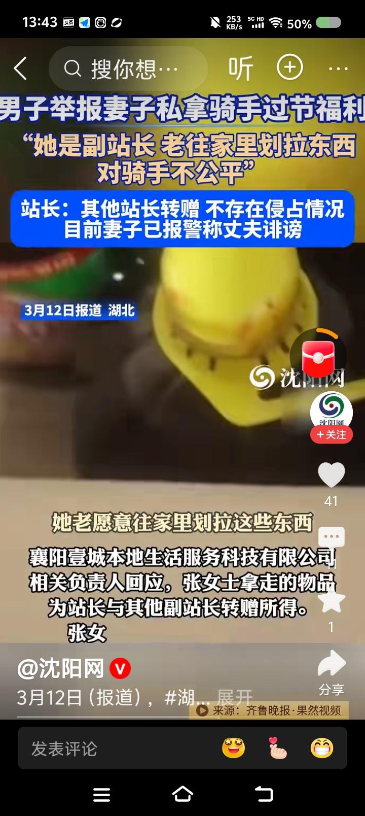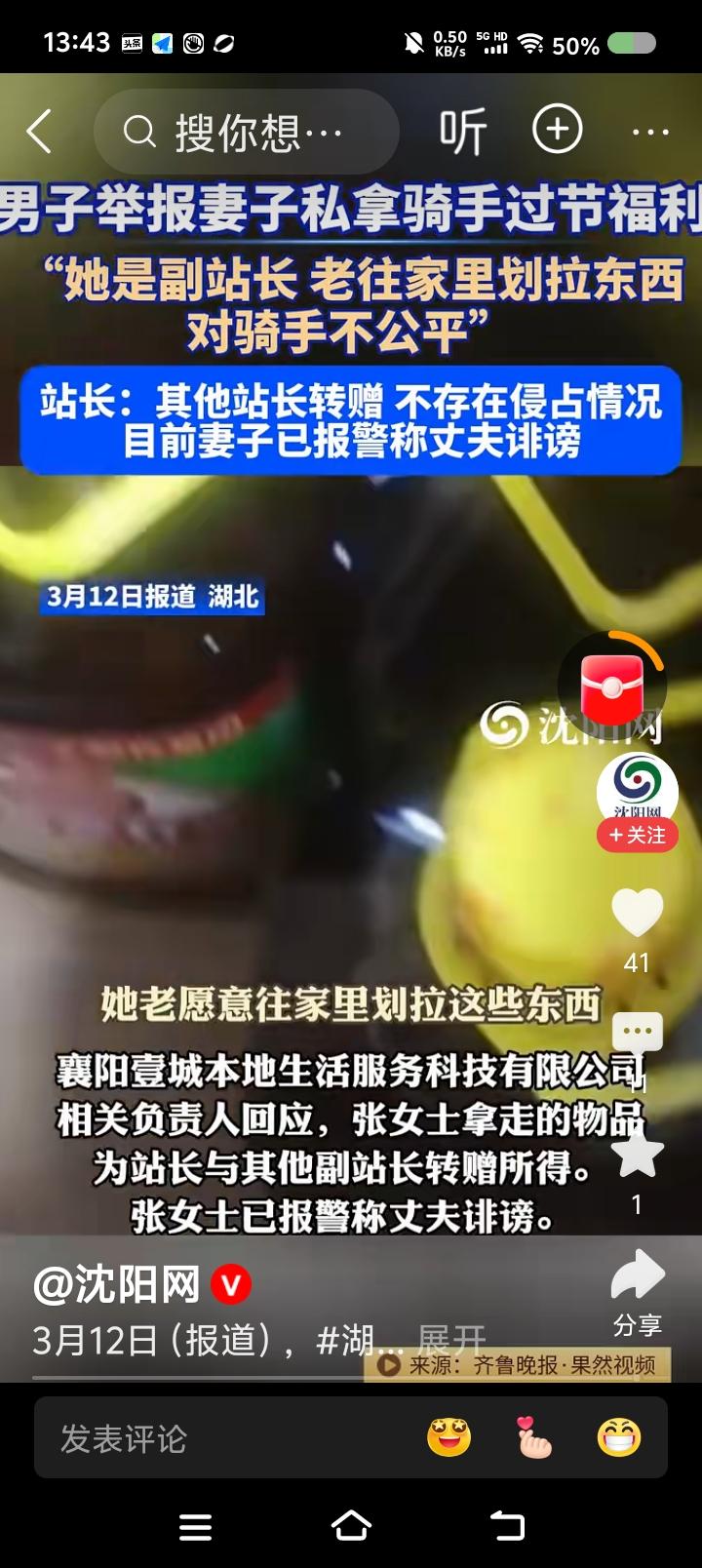 大义灭亲,还是诽谤?—— 据报道,一男子举报妻子身为配送站领导,侵占职工节日福利。 配送站负责人声称,已向工会核实,不属于侵占。 配送代理公司负责人称,此为其他人转赠。 该女子已报警,称丈夫诽谤。 点评: 报道里说,仅春节这一项,女子拿了16桶油,8袋大米,8袋面。 这属实么? 如果属实,怎么解释?转赠了这么多? 建议彻查。