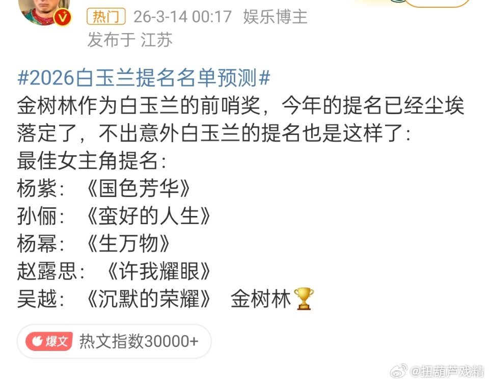 白玉兰视后大年白玉兰自从提名了她,就整个坏了名声,以一己之力毁了白玉兰