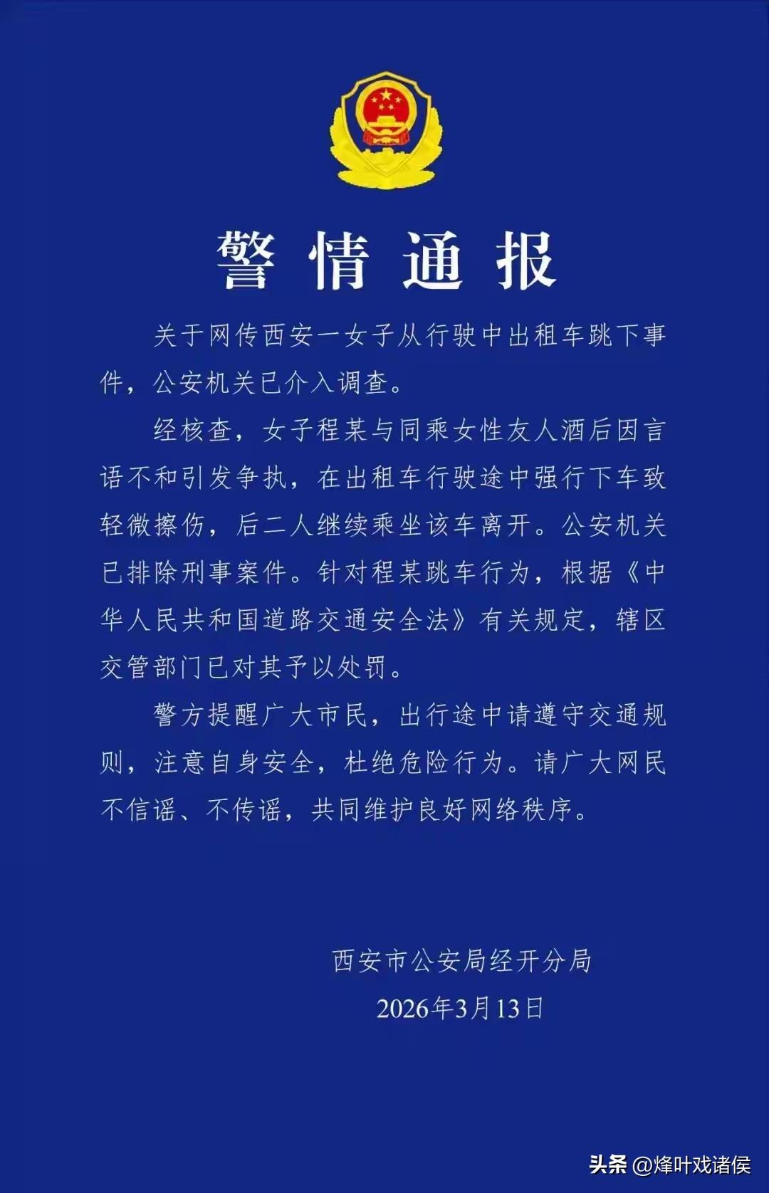 西安出租车女乘客突然开车门跳车,终于等来后续,官方通报了详细过程,跳车原因被公布,万幸的是,跳车女子只是受了轻微伤。 近日,一段西安出租车跳车视频在网上被热议,3月12日晚上的十点多,一辆正在中间车道行驶的出租车突然车门被打开,此后车门一直没有被关上,此时立马车子打开了双闪,并有靠边的动作。 此时,一双女子的脚露在了外面,似乎在踢着车门,10秒后女子从车门掉落,因为车子还未停稳,女子被惯性绊倒在地。 车子停下后,有一男子从后座出来,视频到这里也就结束,因为不清楚到底发生了什么,女子后续怎么样,记者第2天联系上了当地的交通运输部门,对方确实知道这个事,司机正常应急和靠边停车,是两名后座的乘客发生争执后导致的。 当天的警情通报阐述事件的经过,原来后座就两个人,当天两人都喝了酒,先是吵架,后开始动手,接着便是视频里的女子强行下车,还好当天车子已经在减速,女子受了轻微伤,另一名乘客下车后,两人又重新坐回了车上,离开了。 该跳车女子还被罚款了。 这起事件,警方排除了刑事案件,女子只是轻微伤,司机也及时应对,看似 “皆大欢喜”,但并不意味着她的鲁莽行为可以被原谅。 事实上,很多悲剧不是因为事件本身有多严重,而是人在气头上被冲垮了理智,尤其是在酒后。 管住自己的情绪,不是懦弱,而是对自己和他人最基本的保护,假如女子跳车后发生了不可逆转的意外,不仅和他吵架的人,司机估计也要受牵连。 乘车守规矩、遇事冷处理、行为有边界,这既是对自己的负责,也是对他人负责的态度。
