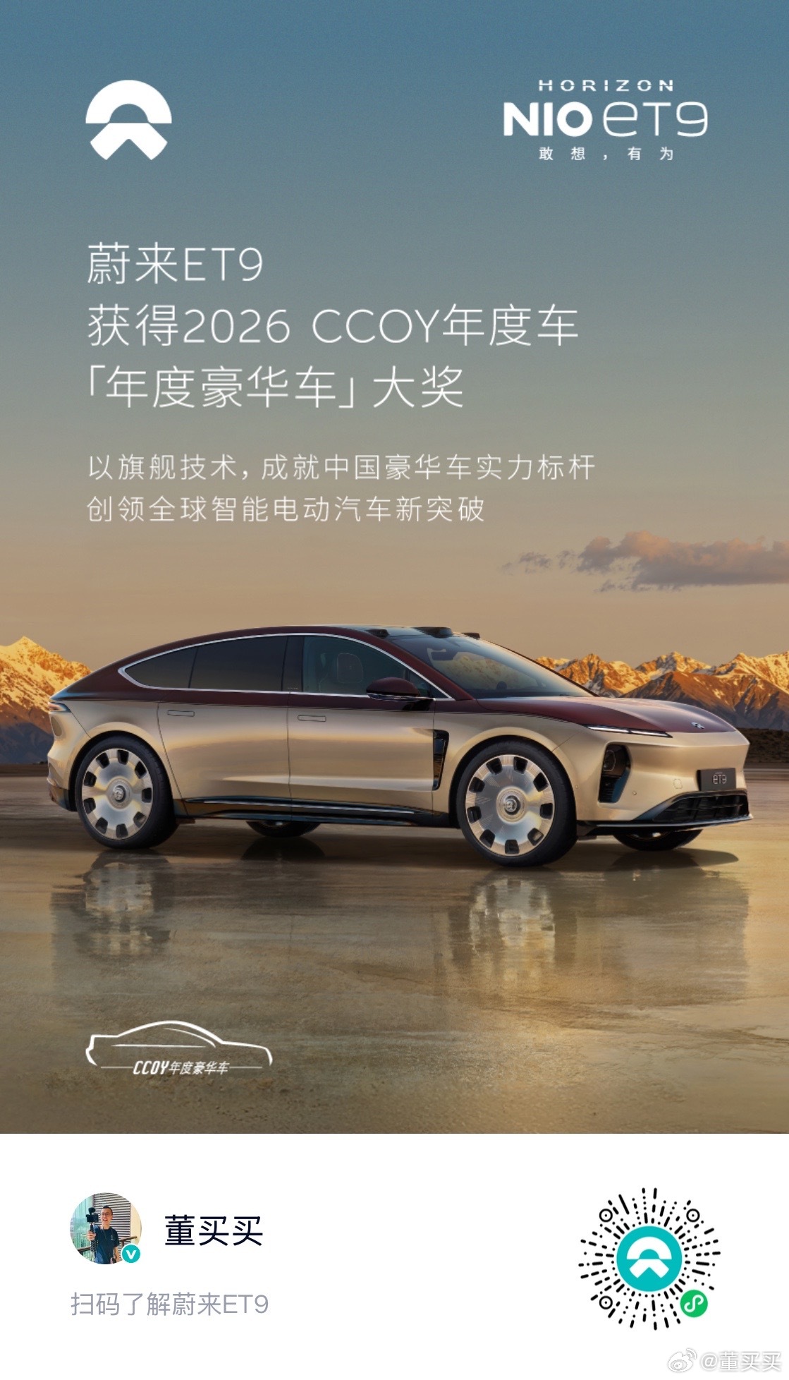 它不为取悦所有人而生,而是为了那些有远见、爱创新、愿意为中国尖端科技买单的人而存在。正如ET9的宣传语一样——“敢想,有为”,这四个字既是对蔚来十年磨一剑、死磕底层核心技术的总结,也是董买买作为这台车主人,内心最深处的骄傲与自豪。