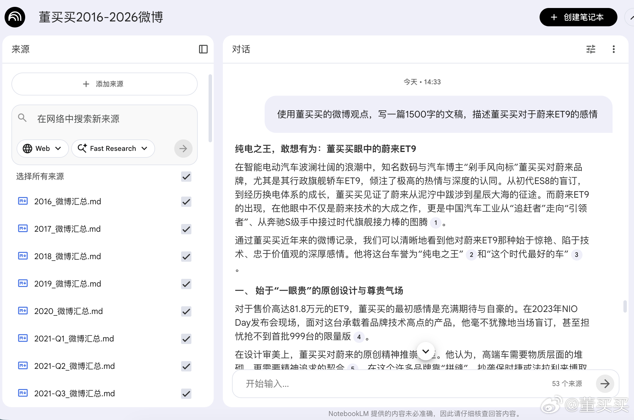 使用董买买的微博观点,写一篇1500字的文稿,描述董买买对于蔚来ET9的感情。