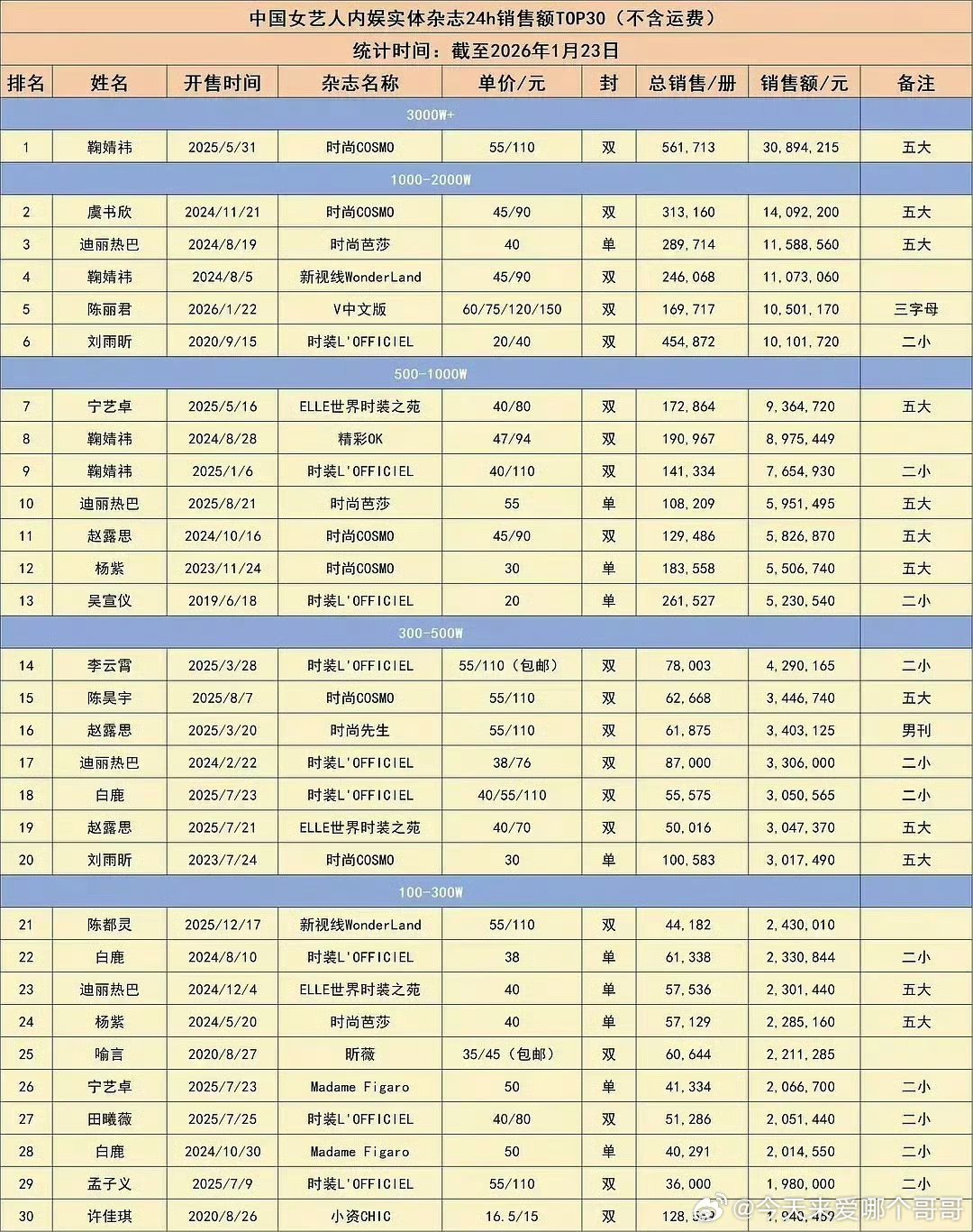 鞠婧祎ELLE一小时战报销售额破688万,女明星杂志销量榜前十占五,女顶流粉实力