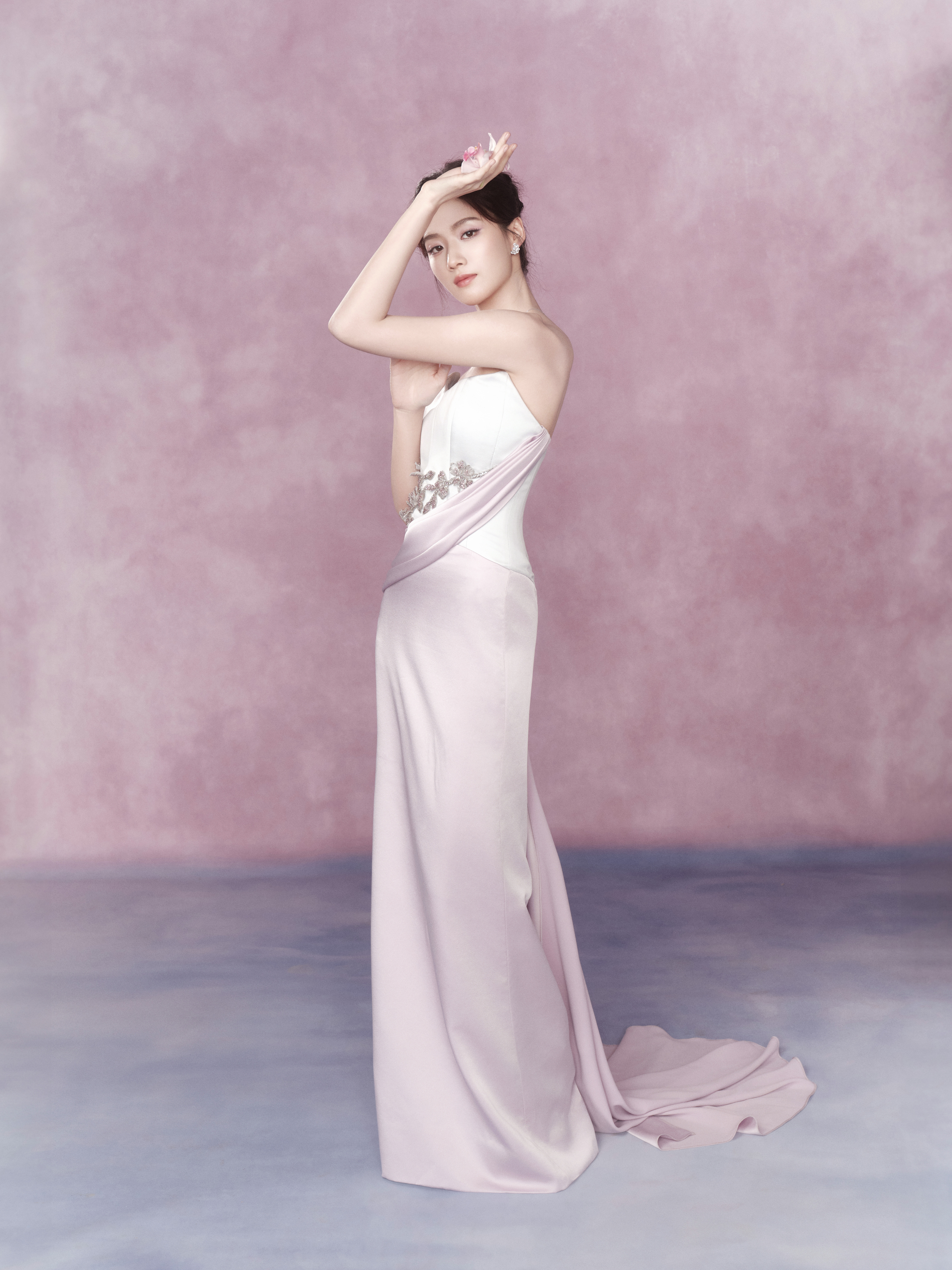 卢昱晓粉紫抹胸裙晕开温柔光晕,紫钻花枝缠绕腰侧,眉眼间是藏不住的清灵与矜贵,