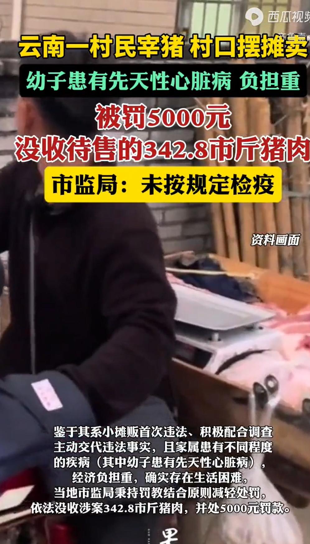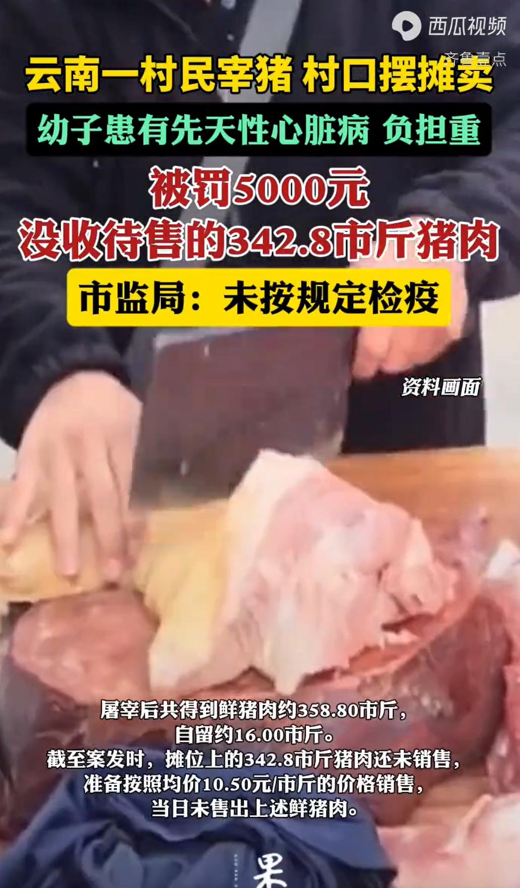 云南砚山,48岁女子为了给患有先天性心脏病的小儿子筹医药费,从市场上买了头猪,在家宰杀后拉到村口卖,想着换点活命钱。肉还没开张,市监局的人就来了,查出肉上没有检疫章,她啥证也拿不出来。按法律,这得罚10万起步。可执法人员到她家一看,心软了:孩子生病、日子紧巴,确实是走投无路才出此下策。结果,猪肉没收了,罚款从10万减到5000。女子咬牙交了钱,但也想不明白:自家宰的猪,咋就犯法了? 杨大姐家的日子,过得紧巴巴的,家里几口人,身子骨都不硬朗,尤其是她的小儿子,打小就查出有先天性心脏病,这是个无底洞,得常年花钱养着。 为了贴补家用,还得照顾家里病人,杨大姐就琢磨着做点小买卖。 在农村,她能想到的来钱快的路子,就是养猪卖肉。 2026年1月12号这天,杨大姐起了个大早,去了趟县城里的一个市场,仔仔细细挑了一头毛猪,花了千把块钱,把这头猪赶回了家。 第二天,也就是1月13号,天还没亮,杨大姐一家就忙活开了。 在农村,杀年猪、卖猪肉,那是祖祖辈辈传下来的营生,没什么稀奇。 她男人把猪宰杀了,拾掇干净,一整头猪去了内脏,连骨头带肉,一共得了三百五十多斤净肉。 杨大姐自己留了大概16斤,说是要给孩子补补身子,剩下的将近343斤,她打算拉到村口卖掉,换些现钱。 于是,她就把这大半扇猪肉,摆在了村入口处的固定摊位上,支起了案子,等着村里和路过的人来买。 可这一天,杨大姐的买卖还没开张,就先等来了穿制服的。 来的是市监局工作人员,他们是下来做食品安全例行检查的。 走到杨大姐的摊子前一看,工作人员就皱起了眉头,这摆在案子上的两大扇猪肉,白白净净的,皮上光溜溜的,既没有盖那种蓝色的、带日期的“生猪屠宰检疫验讫印章”,也没有那种圆形的“肉品品质检验合格章”。 工作人员就问了:“大嫂,你这猪肉检疫章呢?还有检验合格证,拿出来看看?” 杨大姐一听就懵了,她哪有什么证啊? 她对执法人员说,这猪是昨天刚从市场上买来的,早上自己在家杀的,还没开张卖呢,肉是绝对好肉。 执法人员耐心跟她解释,现在国家有规定,猪肉要上市销售,必须经过定点屠宰场的正规检疫和检验,有了“两章两证”,才能确保这肉没有病害,没有瘦肉精,是安全的。 像她这样自己在家宰杀,没有任何检疫手续就拿出来卖,是违法的。 杨大姐听了,脸都白了,她哪懂这些啊?她只知道,这是她一家人的生计,是给孩子看病的指望。 执法人员按规定,对现场进行了拍照、取证,做了一个详细的现场检查笔录。然后,把杨大姐摊位上这342.8斤的猪肉,依法进行了扣押。 这些肉,不能卖了,要作为证据封存起来。 杨大姐看着自己辛辛苦苦弄来的肉被拉走,心里像刀割一样。 市监局调查清楚后,本着《行政处罚法》里“处罚与教育相结合”的原则,既不能因为同情就免于处罚,让法律失去威严,也不能一棍子把人打死,让这个家庭陷入绝境。 最终,市监局在法律允许的幅度内,对杨大姐进行“减轻处罚”。 2月24号,市监局给杨大姐送达了《行政处罚告知书》,拟对她处以5000元罚款,同时,那342.8斤被扣押的猪肉,依法予以没收。 工作人员还告诉她,如果对这个处罚有意见,可以提出陈述和申辩,甚至可以要求举行听证会。 杨大姐拿着那张纸,手都在抖,5000块,对她家来说,也是一笔巨款。可她心里也明白,工作人员跟她说了,按法律规定,本来最少要罚十万的,现在罚五千,已经是考虑到她家的困难了。 她想了几天,最终没有去申辩,也没有要求听证。 3月13号,有记者听说了这事儿,打电话到村里和县里核实情况。 村里那边,没人接电话。 但从市监局得到了证实,杨大姐的罚款,已经交上了。 这钱,不知道是她从哪儿借来的,还是从牙缝里挤出来的。 有人说,看着真不是滋味儿。一个农村妇女,家里孩子有病,日子都快过不下去了,好不容易宰头猪想换点钱,结果肉没了还得倒贴五千块,有违过罚相当原则。 也有人说,这话说的,那万一她这猪有病呢?卖给村里人吃了中毒谁负责?我支持罚款,食品安全这事儿就不能讲人情,讲人情就得出大事儿。 《食品安全法》第三十四条规定,未经检验或者检验不合格的肉类制品,不能卖。 杨大姐自己宰猪摆摊,肉上没章、手里没证,事实清清楚楚,违法没跑。 法律这么严,是为了防病猪肉流进市场,跟肉好不好没关系。 按《食品安全法》第一百二十三条,货值不够一万的,起步就得罚十万。 但《行政处罚法》第三十二条规定,对于主动交代、积极配合、没造成危害,都可以减轻。 杨大姐肉还没卖出去就被查了,态度也好,再加上家里孩子有病、日子实在紧巴,市监局从十万降到五千,法律上站得住脚。 对此,你怎么看?