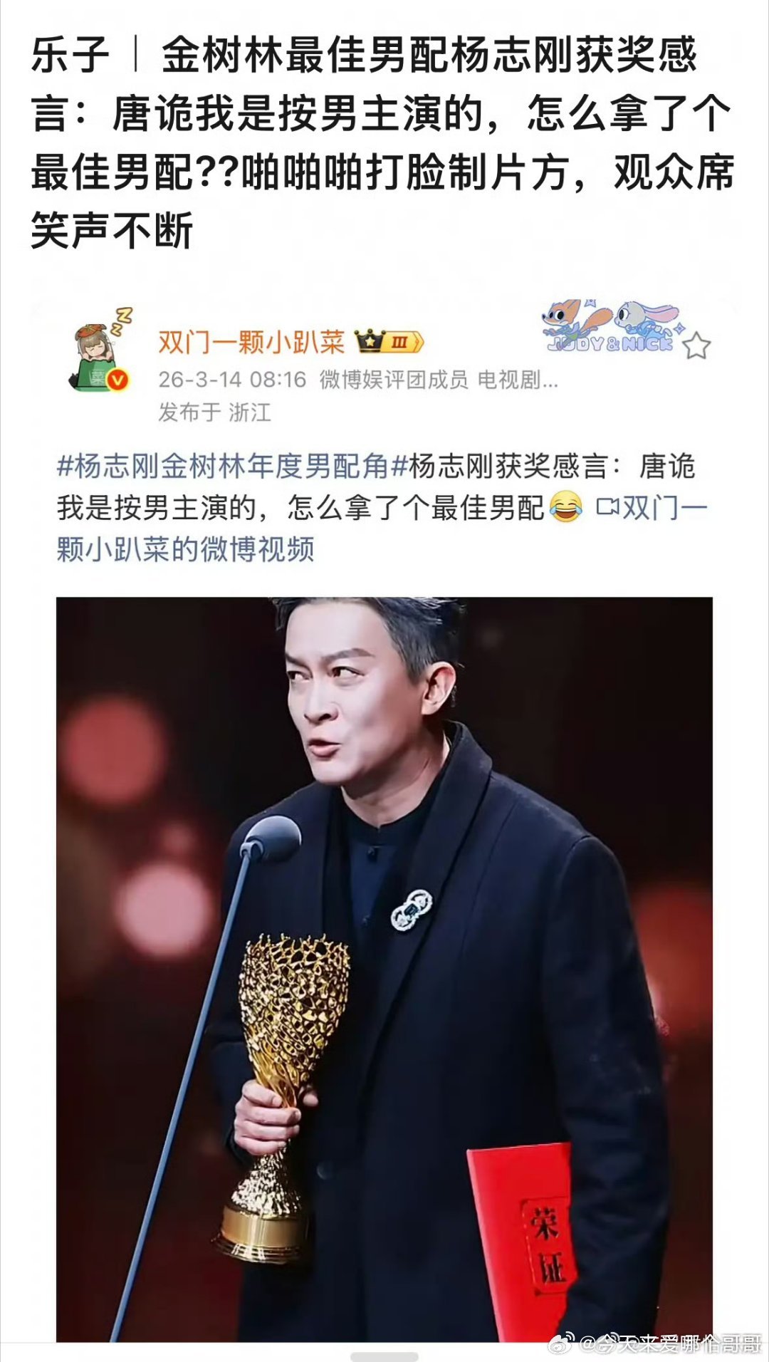 这个奖真是瞎搞,给杨志刚最佳男配,给杨旭文最受欢迎男演员,唐诡男主到底是谁
