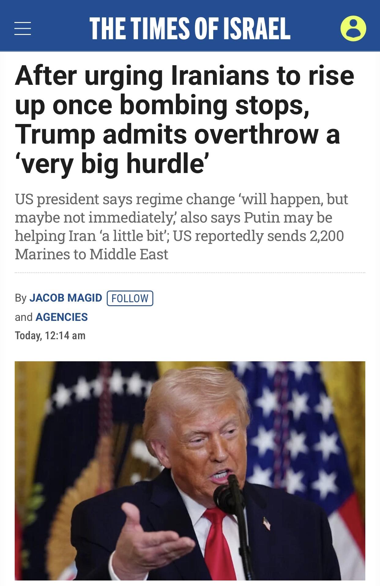 以媒:特朗普又改口了,称”指望伊朗人推翻现政权有很大障碍” 以色列《以色列时报
