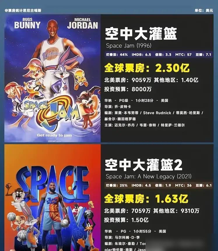 乔丹赚10亿,詹皇赔本,库里十天破亿 你砸1.5亿拍电影,票房刚够回本,还拿了金酸莓最差男主角 这不是虚构剧情,是勒布朗·詹姆斯2021年的真实遭遇 1996年,乔丹拍《空中大灌篮》,8000万预算,光衍生品就赚超10亿 那是录像带时代,观众买带租带,给电影续上长期收入 2021年,流媒体分流,疫情缩短院线窗口,《空中大灌篮2》同步上线HBO Max,第二周末票房暴跌69% 2026年,斯蒂芬·库里的《GOAT》,十天突破1亿美元票房,第二周末仅微降 换做是你,你会只靠明星光环,还是抓牢观众的共情需求 能抓住观众的,才是真的GOAT