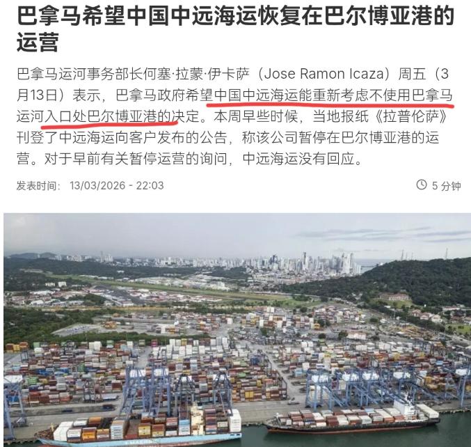 巴拿马政府喊疼了,希望中国恢复在巴尔博亚港的运营! 3月14日,根据法新社报道,巴拿马运河事务部长何塞·拉蒙·伊卡萨表示,巴拿马政府希望中国中远海运能重新考虑不使用巴拿马运河入口处巴尔博亚港的决定。中远海运的问题确实让我们有些意外,每一批货物都很重要,中远海运的货物对我们、对巴拿马来说显然尤为重要,我们当然希望他们能重新考虑不使用巴尔博亚港的决定。 巴拿马为什么这么慌?因为疼到肉里了。别看中远海运的货运量只占巴尔博亚港总量的4%,好像不多,但这4%背后代表的是中国这个全球最大贸易国和制造业中心的态度。 巴拿马运河是巴拿马的命根子,运河收入能占到全国GDP的7%以上,政府财政超过20%的钱都指着运河的分红。中国货轮是巴拿马运河最大的客户群之一,中国货物贡献了运河通行费的将近30%。 中远海运作为中国航运的龙头老大,它这一撤,不仅仅是一个4%的数字问题,它释放了一个极其危险的信号:中国的船和货,可以不再依赖你巴拿马运河了。 这可不是吓唬人。中国早就未雨绸缪了。在秘鲁的钱凯港,中远海运深度参与建设和运营,2024年试运营,2026年已经全面开港了。这个港能停靠超大型集装箱船,根本不受巴拿马运河那狭窄船闸的限制。 从上海到钱凯的航线已经常态化运行了。这意味着什么?意味着中国在美洲西海岸有了一个全新的、自己说了算的物流枢纽。 巴拿马部长现在说“每一批货物都很重要,中远海运的货物对我们、对巴拿马来说显然尤为重要”,这话听着挺诚恳,但仔细一品,全是生意经,毫无诚意。 他只字不提怎么纠正自己非法接管港口的错误,不提怎么赔偿长和集团的损失,不提怎么恢复合法的商业合同。他的潜台词就是:以前的事儿咱翻篇了行不?你们中国的货轮赶紧回来吧,继续给我们送钱。 天下哪有这么好的事儿?你砸了人家的锅,还想让人家继续给你做饭吃,这不是做梦吗? 中远海运这一停,停得漂亮。它用最纯粹的商业行为告诉全世界,尤其是告诉那些想跟着美国有样学样、动不动就想没收中资资产的国家:中国的企业是讲规则的,但也不是好欺负的。 你不守契约,我们就用脚投票。中国的全球化布局早就不是把鸡蛋放在一个篮子里了。你巴拿马运河很重要,但也没重要到不可替代的地步。现在疼了?疼就对了。疼了才知道,有些便宜不能乱占,有些红线不能乱踩。 光靠几句不痛不痒的喊话,是挽回不了被透支的国家信用的。真想解决问题,得拿出实际行动,把该还的还回来,把该赔的赔清楚。否则,喊破喉咙也没用。