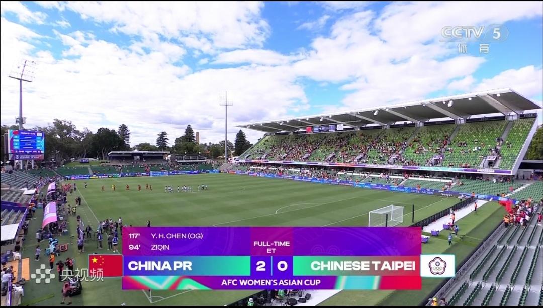 中国女足2:0胜中国台北女足,晋级半决赛!同时获得了2027巴西女足世界杯参赛资格! 女足亚洲杯1/4决赛,中国女足90分钟常规比赛0:0,加时赛2:0锁定胜局!晋级半决赛! 第一粒进球,94分钟,3号陈巧珠传球,7号王霜做球,23号邵子钦破门攻入! 第二粒进球,117分钟,替补上场13号金坤传中,造成对方烏龙球! 中国女足同时获得了2027年巴西女足世界杯参赛资格! 3月17日 18:00 女足亚洲杯半决赛 中国Vs东道主澳大利亚 加油,中国女足!