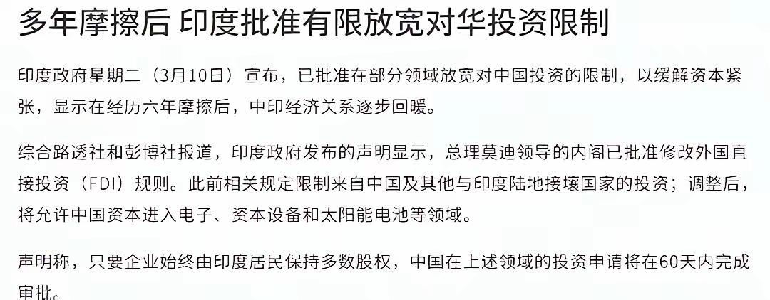 印度人放宽对华投资限制,说白了又想空手套白狼: 你们出钱出技术,你们没有任何权利。挣的钱归我,公司归我。 问题是,就这样还有很多企业去! 人家敢出这样的政策,就是算准了我们还有企业要去啊,肥私的事! 就算私营企业,也不只是一个人的钱!