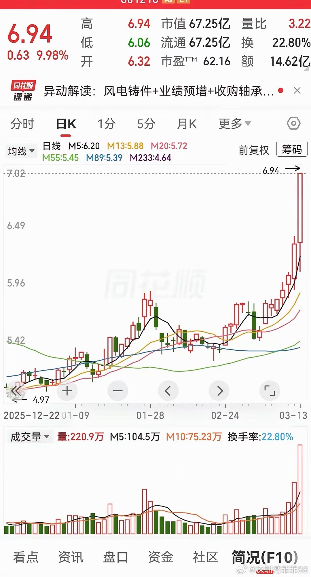 扣非净利润竟然暴涨6~10倍,去年的业绩还是挺炸裂的。有人说它的上涨典型是业绩驱动的。不过业绩好的未必就能上涨,还是需要有风口。现在的风口就是风力发电,风电。它最主要是做风电铸件的,不过现在又收购了一家轴承公司。而轴承又是风力发电的关键核心部件。而这样的收购补足加工的短板,它不仅仅提供风力发电的铸件,而且是系统性的供应商。在风力发电这个领域,他们的话语权,专业度更有竞争力。虽然它是个人股东控股,但是也不乏外资机构进驻。高盛和UBS两家顶级外资机构2025年第三季度已经进驻了。而且牛散也已经加仓了,说明还是有不少人是比较看好。