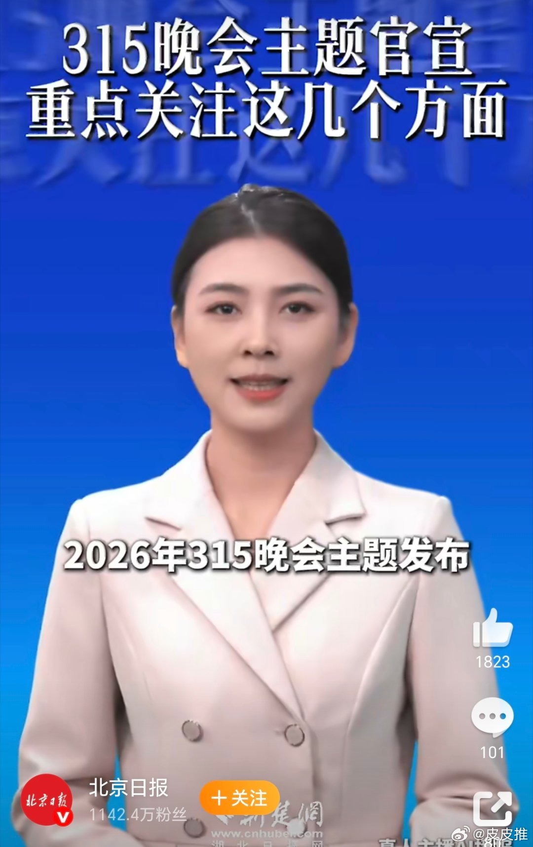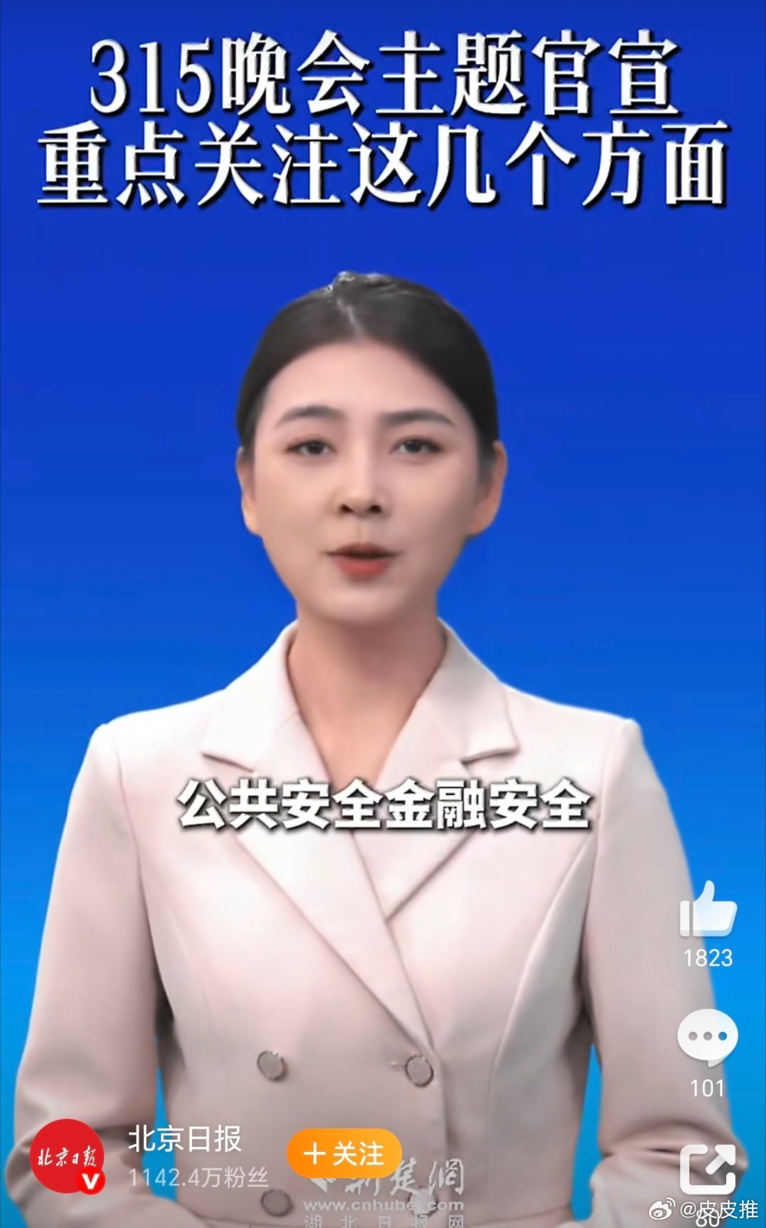 央视315晚会点了4个领域今年的央视315晚会,主题已经确定了,将重点关注食品安全、公共安全、金融安全、广告市场等领域。