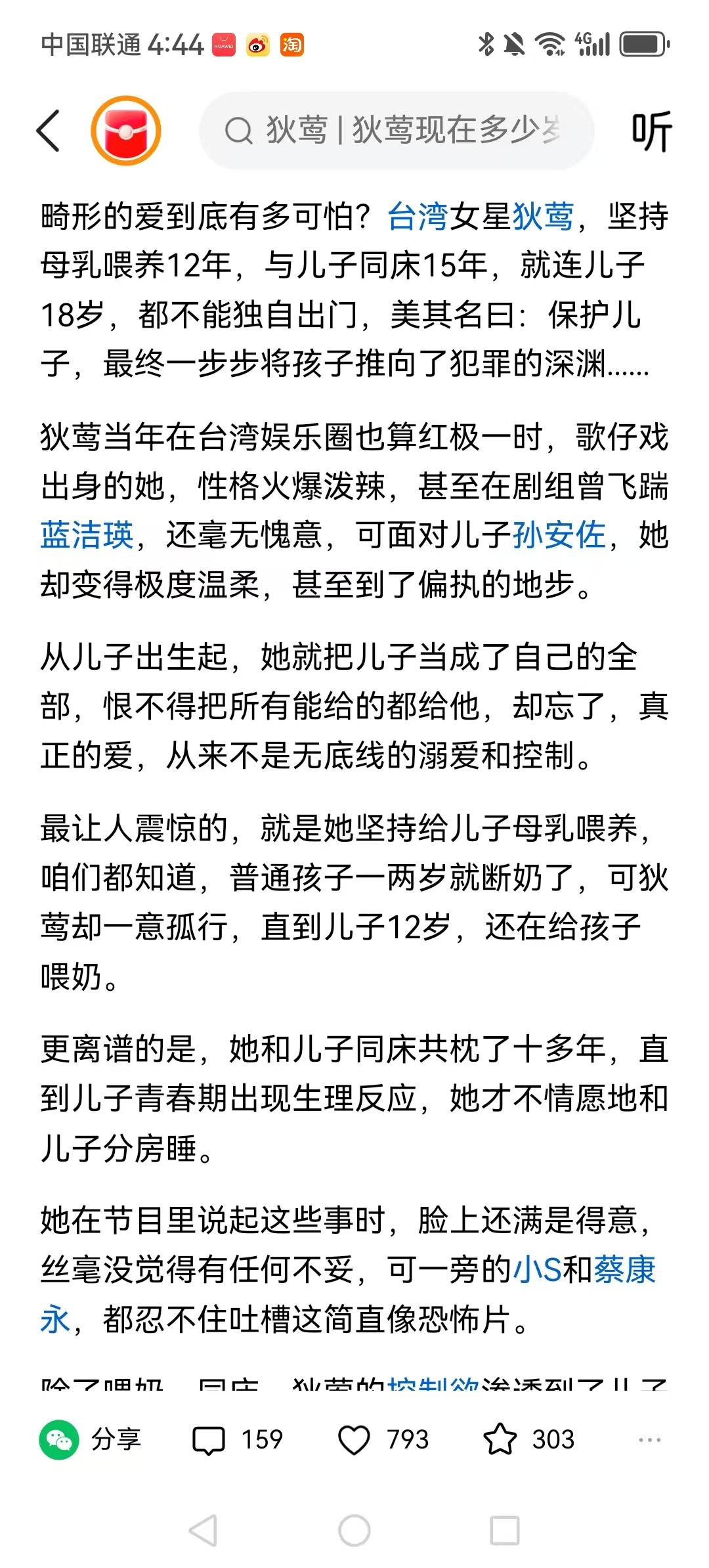 畸形的爱到底有多可怕?台湾女星狄莺,坚持母乳喂养12年,啥都不好奇,只好奇她老公在干嘛呢。 这种女人一看就是任性,肯定离婚了,因为任性才会把孩子养成这样,鼓吹去父留子的女人都是这样任性的巨婴所为。 只有我觉得她当年飞踹蓝洁瑛,这是她恶有恶报么? 欺负蓝的人真的都是恶人,比如强暴她的渣。是啊,蓝洁瑛命那么苦,居然还被她欺负过!可恶的女人必有恶报。 狄莺已经得了严重的强迫症、妄想症,因此导致了她的强烈的控制欲。 以后谈男朋友一定不能找这种恋母的,还有那种想和儿子结婚的妈。 18岁才母子分床,这样的母亲纯属变态,这已经不是宠爱的问题了,这是在纵容教唆伦理犯罪了。