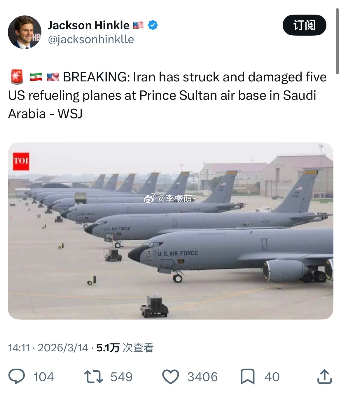 《华尔街日报》报道(援引两位美国官员的话)称,在伊朗最近对沙特阿拉伯苏丹王子空军基地的导弹袭击中,五架美国空军加油机受损,但并未被摧毁。无人伤亡;飞机正在维修中。