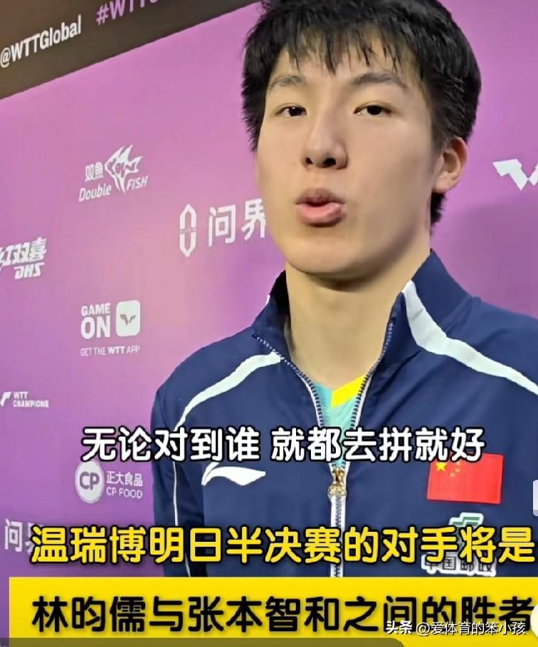 虽然张本智和在比赛当中喜欢大叫大嚷,而且经常情绪外漏,让自己有出色发挥之外,还经常会影响对手的比赛情绪。但整体上来说,张本智和的综合竞争力,包括他打困难仗的能力以及运用自己特长技术的能力也确实一直在进步和提高当中,所以当重庆冠军赛男单8进4争夺战当中,张本智和迎来和中国台北名将林昀儒之间的正面交锋时,张本智和还是展现出在对方面前胜多负少方面的心理优势,在先赢一局又被对方追上然后再赢一局继续被对方把大比分追平的前提下,依靠第五局和第六局比赛节奏和出手效率方面的优势,最终实现了4:2的胜出。也确保自己拼下一个男单四强席位,再度成为本次赛事种子球员当中相对平稳过渡,走的较远的一个。 至少这样的一种表现,也将在下次世界排名再度出炉时,确保张本智和可以重新提升世界排名,稳住在世界大赛当中的气场,为争取在到更大的赛事当中展现自身竞争力创造更好的条件。双方六局的具体比分11:8、5:11、11:9、2:11、11:7和11:6, 总的来说,透过张本智和的晋级,也让自己与国乒年轻小将温瑞博将在男单半决赛当中迎来正面交锋,这对于双方来说都是一大挑战。温瑞博士已经把莫雷加德、邱党这样的世界名将淘汰出局,而张本智和则通过过掉林昀儒这一关,再次证明了自身实力。 那么上升势头迅猛、气势正盛的国乒小将温瑞博,面对把林昀儒这位掌控力十足的实力派球员淘汰出局的激情型打法球员张本智和,又会有怎样的发挥呢?他们中间谁能通过彼此之间的硬碰硬较量,成功拿到一个男单决赛的名额呢?让我们期待比赛精彩上演,也让我们再次祝贺温瑞博突破自我的同时,正一步步向着自己期待中的位置大踏步前进,就看他到底能走多远,又会给我们带来怎样的惊喜了。