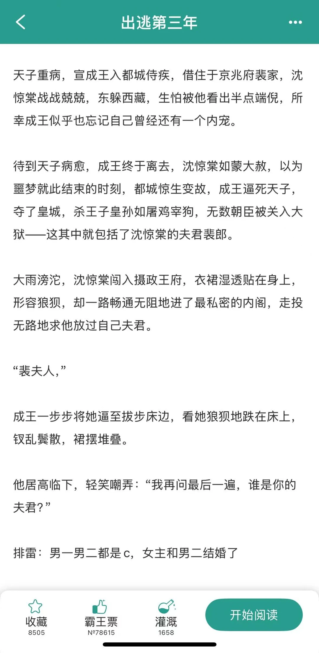 [集美R]聪慧坚韧 x 偏执疯批 [集美R]古言/穿越/强取豪夺/狗血/追妻/极限拉扯 [大笑R]故事狗血元素还蛮多,强取豪夺+极限拉扯+追妻+她逃他追+恨海情天,但作者大大的文笔不错,这么多元素堆砌也没有冗杂的感觉,反而有一种爱恨交织的感情。 [大笑R]前期女主跟男主在一起的时候处于下风,但女主内核比较稳,看似妥协,其实是伺机而动;男主么看起来是个偏执疯批,但其实内核没有女主稳,从一开始看不上女主到步步沦陷,到最后为爱折腰,整个感情发展的过程也是男主从上位者到下位者的过程。