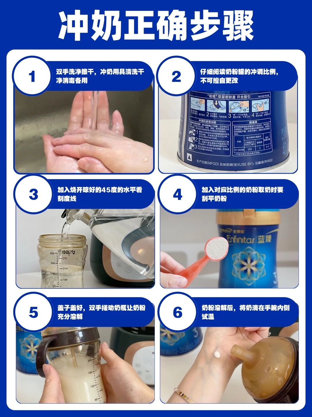 ⚠️记住:严格按冲调比例来,先加水后加粉,平勺刮平。双手搓动瓶身,千万别上下猛摇;冲完静置一分钟再喂宝宝,能避免胀气、吐奶的情况。