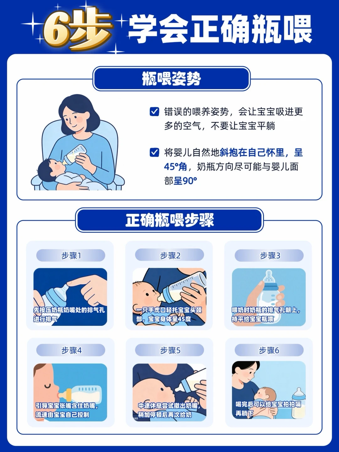 错误的喂奶姿势,会让宝宝吸进更多空气,导致胀气、吐奶。应将宝宝斜抱在怀里,呈45°角,奶瓶方向尽可能与婴儿面部呈90°。