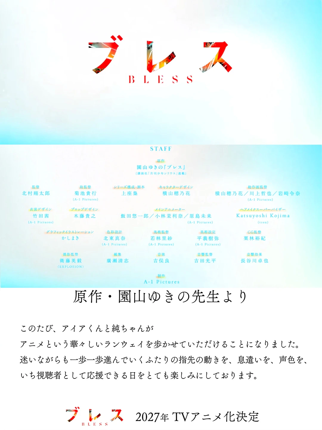 🎬番名《祝福 BLESS》 🎉时间:2027年开播 🔥类型:青春 校园 彩妆 励志 成长 ✅剧情简介 前模特儿宇田川艾亚(少年)原本怀揣着成为化妆师的梦想,但因为害怕被周围的人否定,一直将这个梦想埋在心里。某一天,艾亚与一位总是弓着背、试图遮掩脸上雀斑的安静女孩——炭崎纯,一起参加了学校文化祭的比赛。这是一个两人一组走上T台的比赛,由一人担任负责服装与发型化妆的造型师,另一人担任模特。艾亚负责为炭崎化妆。在与炭崎的交流中,艾亚发现了她在教室里从未展现过的魅力。于是他决定通过化妆将炭崎的魅力最大程度地展现出来,两人一起向文化祭的舞台发起挑战 【STAFF】 原作:园山雪乃 监督:北村翔太郎(败犬女主太多了、Mafiosa) 助监督:菊池贵行(A-1 Pictures) 系列构成·脚本:上座枭(参与的第三部TV动画作品,前两部是悠哉日常大王 Nonstop、相合之物) 人物设计:横山穗乃花 总作画监督:横山穗乃花·川上哲也(A-1 Pictures)·岩崎令奈 服装设计:竹田茜(A-1 Pictures) 道具设计:木藤贵之 主动画师:饭田悠一郎·小林茉利奈·原岛未来(A-1 Pictures) 妆造总监:Katsuyoshi Kojima(tron) 平面插画:かしまき 色彩设计:北东真奈(A-1 Pictures) 美术监督:若林里纱(A-1 Pictures) 美术设定:平義树弥(A-1 Pictures) CG监督:栗林裕纪 摄影监督:卫藤英毅(EXPLOSION) 剪辑:广濑清志 音乐:吉俣良 音响监督:吉田光平 音响效果:长谷川卓也 动画制作:A1 动漫动漫推荐日漫新番漫改番祝福BLESS2027年新番新番动漫画风绝美