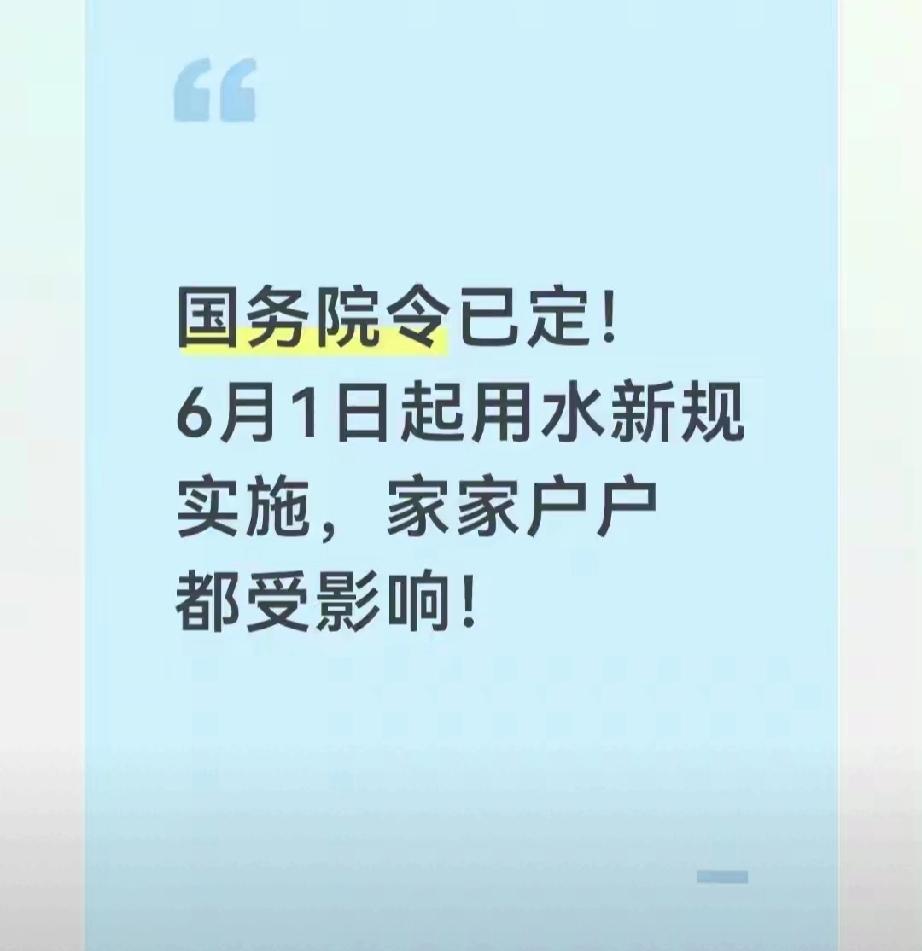 国务院令已定!6月1日起用水新规实施,家家户户都受影响! 2026年2月11日,国务院正式发布第831号令,全新《供水条例》通过审议,明确自2026年6月1日起全国统一施行,同时废止沿用32年的旧版《城市供水条例》。这不是小修小补的调整,而是从源头规范用水收费、保障群众权益的重磅新规,核心就是一句话:不合理收费全面取消,历史多缴费用可退,全民实实在在受益。 32年的旧条例早跟不上民生需求,城市与农村供水标准不统一,各类附加收费藏在水费里,普通家庭常年花冤枉钱。 高层住宅的二次加压费、公共管网损耗分摊费,本该由供水企业承担,过去全转嫁给住户,每月平白多出一笔开支。 物业代收水费私自加价的情况遍地都是,官方定价和实收价格有差价,长期累积下来是一笔不小的负担。 水表到期轮换、故障检定,过去全要用户自费,计量不准造成的多缴费用,大多只能住户自己承担。 新规直接取消所有不合理收费,供水企业、物业、开发商都不能再设置名目加收费用,违规操作会被严厉处罚。 历史多缴费用可退是实打实的权益,保留好缴费凭证、转账记录,就能申请核查退款,不用再为过往的乱收费吃闷亏。 条例删掉“城市”二字,农村规模化供水纳入统一监管,城乡用水实现同网、同质、同服务,农村家庭也能享受城市级饮水保障。 供水单位必须公开水质、水价、服务流程,定期公示检测数据,老百姓用水安全全程透明,不用再担心水质不达标。 停水、降压必须提前24小时告知,紧急抢修也要及时通知,无故断水造成居民损失,企业要依法承担责任。 老旧管网改造、设施维护的成本全部由责任主体承担,住户不用分摊费用,管网漏损被严格管控,从源头减少浪费。 新规不搞花架子,每一项都对准用水领域的长期痛点,把收费的主动权、用水的知情权还给群众。 政策落地不看口号看实效,取消乱收费、退还多缴款、规范全流程,真正做到为民生减负、为群众谋利。 这是一次贴近生活的法规升级,更是守护千家万户基本权益的实在举措,每一户家庭都能真切感受到变化。 各位读者你们怎么看?欢迎在评论区讨论。