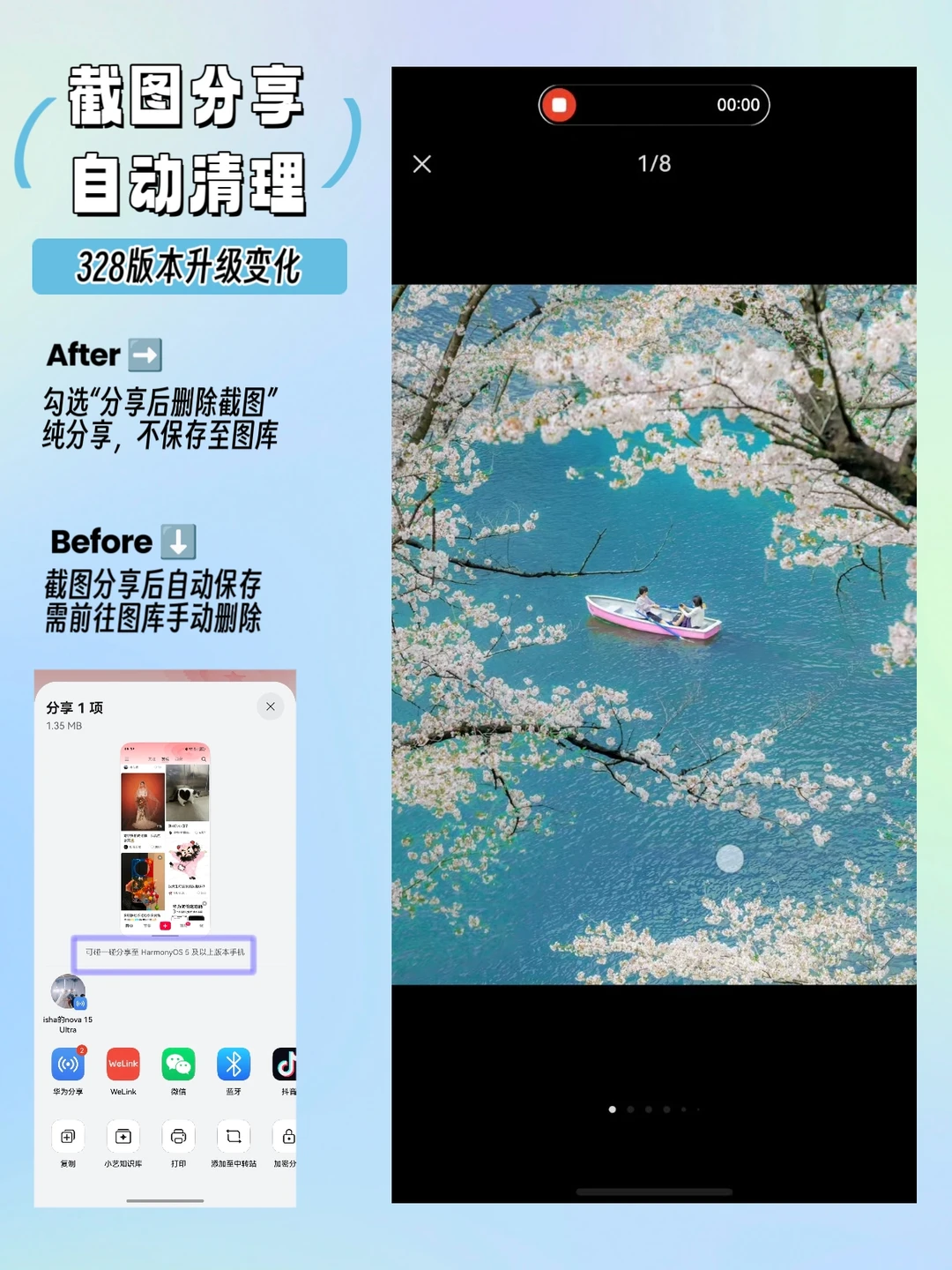 自打升级了鸿蒙6的328版本 手里的nova 15更好使了[派对R] 截图这两处变化,强迫症狂喜: ✅️带壳截图新增“覆盖原图” 点一下,只存一张带壳的,图库里清清爽爽 ✅️截图分享可以“自动清理” 分享完自动删,不用再去图库里翻着删了,纯分享真省事儿 以后手机里再也不会有那么多奇奇怪怪的截图了,开心~ 大家也快去升级试试吧[斜眼R]