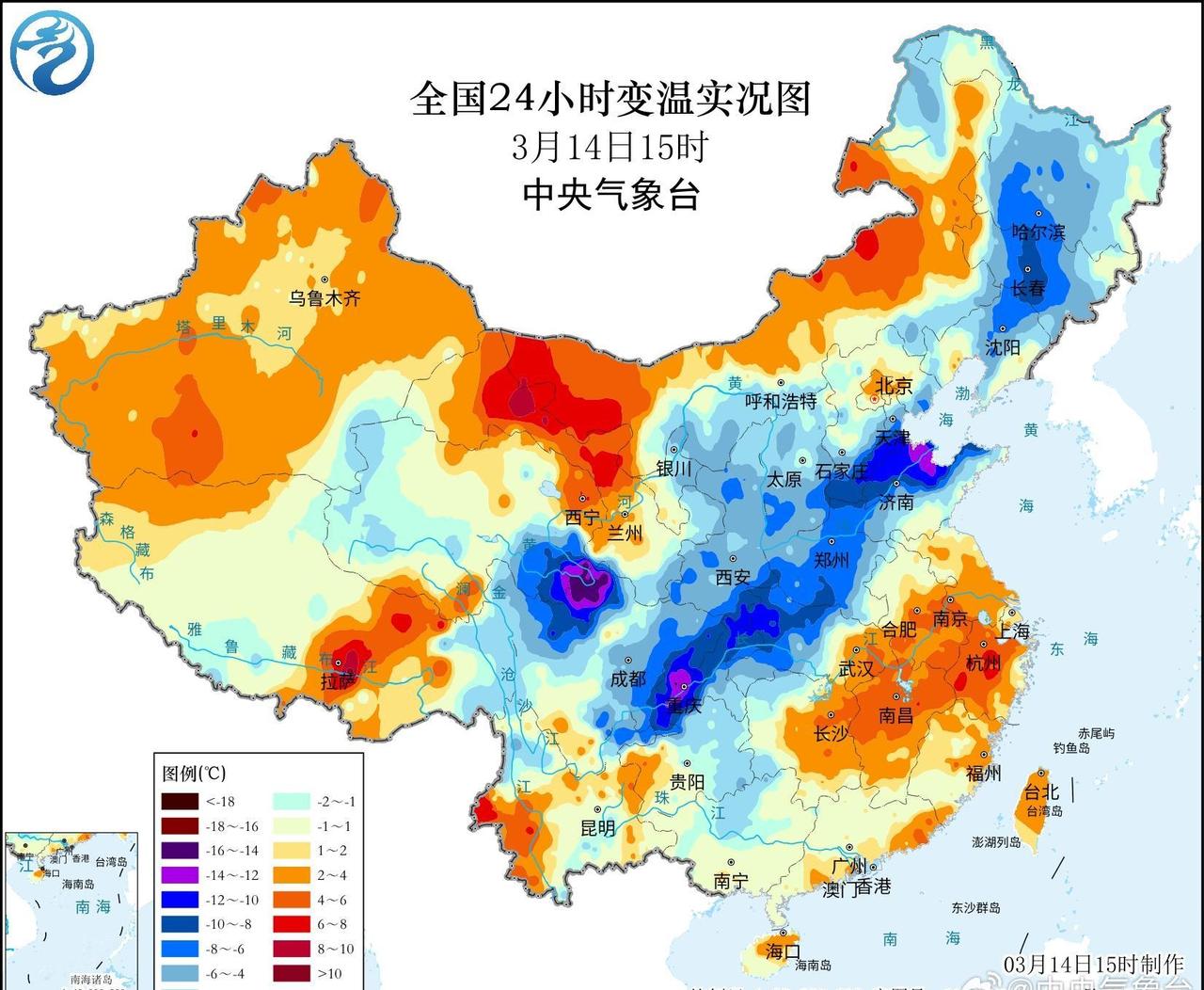 冷空气影响持续,西南到东北地区今天下午出现明显降温,四川北部、重庆西南部、山东北部等地部分地区降幅超过10℃。