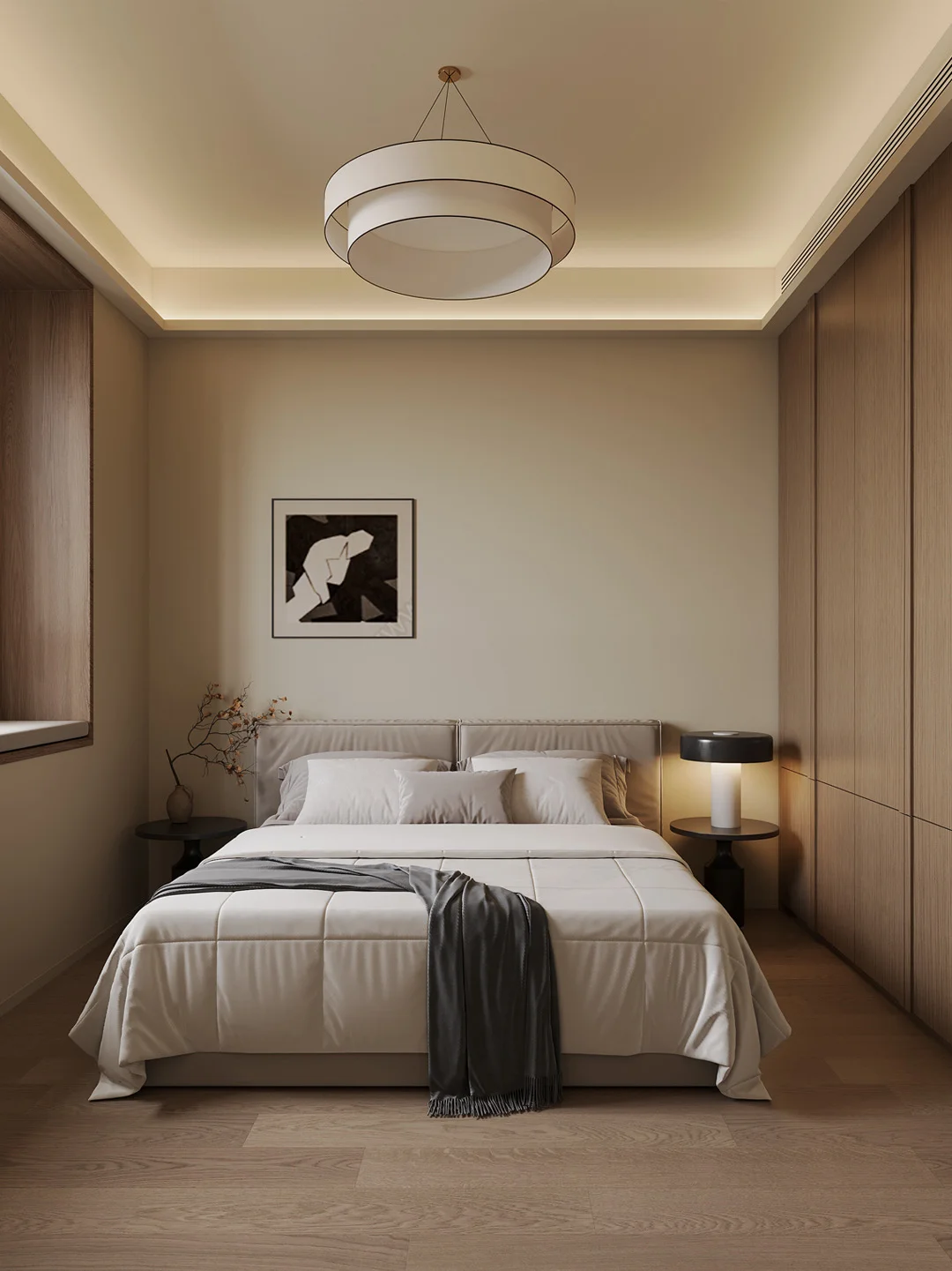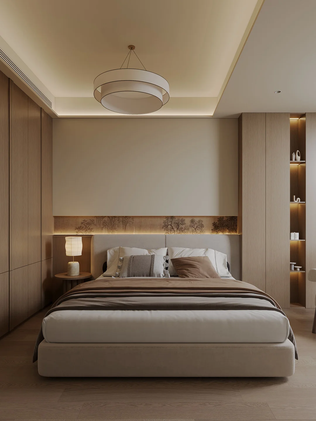· ☀️色调——低保和度米白色,自带伸缩感 新中式崇浅米色、茶白、棕霖。 ☀️材质——“见素抱朴”,用天然材质回归宁静 以木、麻、绢为主,床木格栅+素雅软包,搭配轻薄。 ☀️软装——少即是多,留白才是高级感 一盏素雅台灯,一把休闲单椅,一片淡墨山水软包,搭配月环灯诗意满满。 ☀️光影——让卧室带来双重感 选择暖色温的吊灯+台灯+灯带,让光线柔和不刺眼。