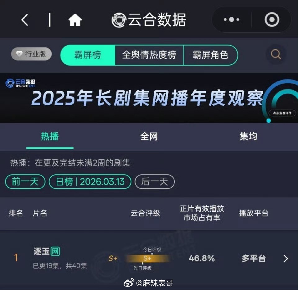 《逐玉》云合数据已经达到46.8%,超过了《生万物》,重点是这部剧还播了一半不到,超过《庆余年》和《狂飙》只是时间问题了吧?
