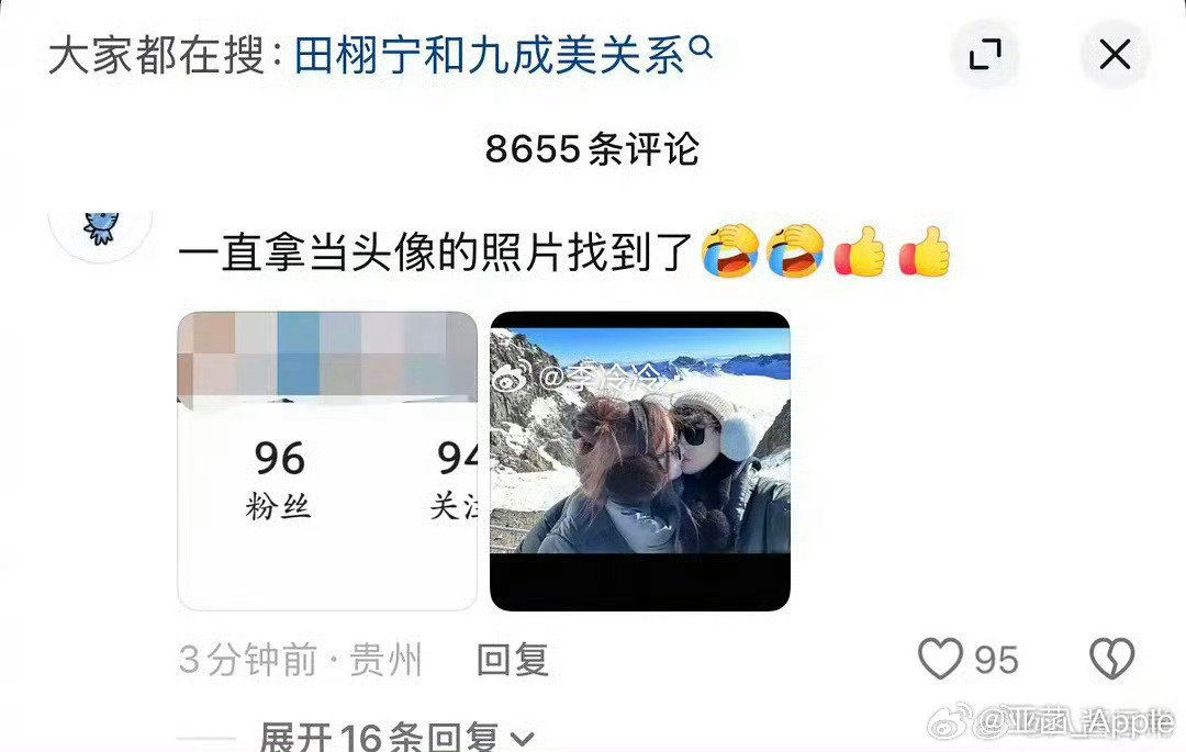 今天九成美 田栩宁的热搜挂了一天了,先是九成美晒与田栩宁亲吻视频,接着又爆料九成美曝田栩宁出轨有孩子,现在九成美刚刚更新的45张live,粉丝头像 嫂子拍的,然后田栩宁方将起诉九成美,九成美直接发问“你要告我吗”