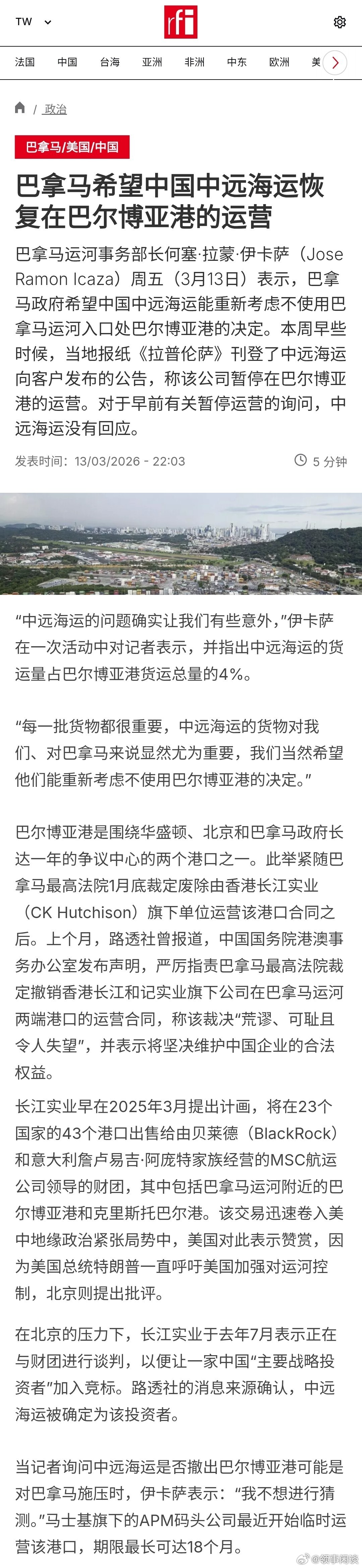 【巴拿马希望中国中远海运恢复在巴尔博亚港的运营】