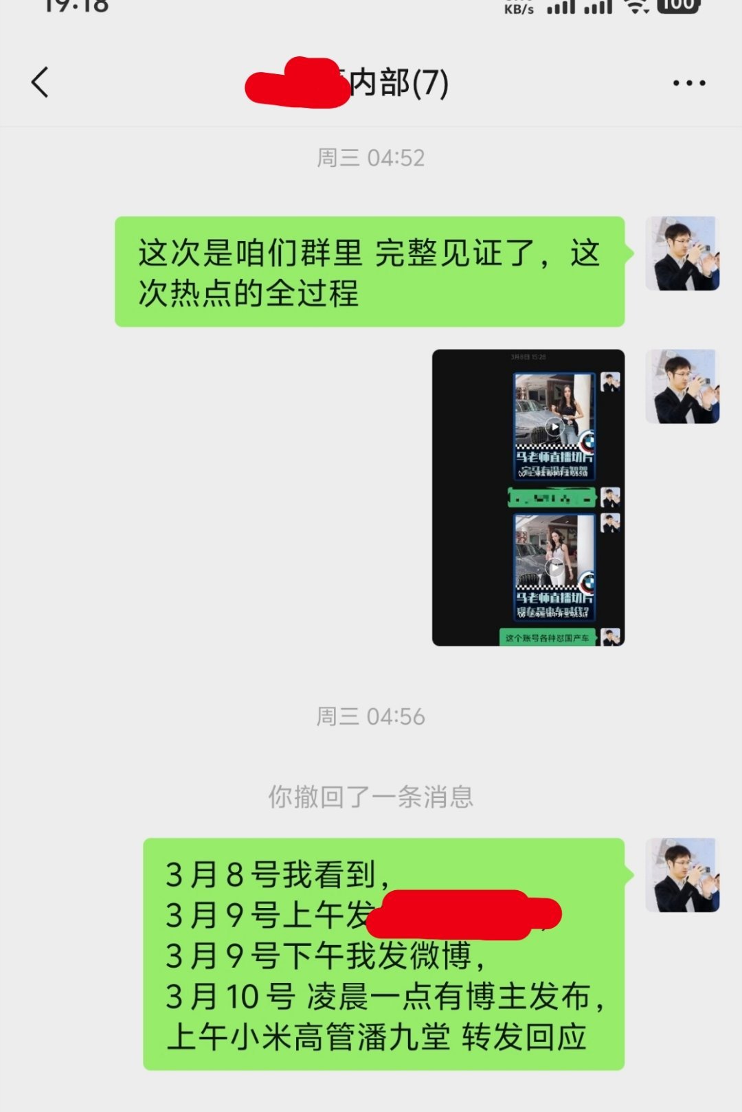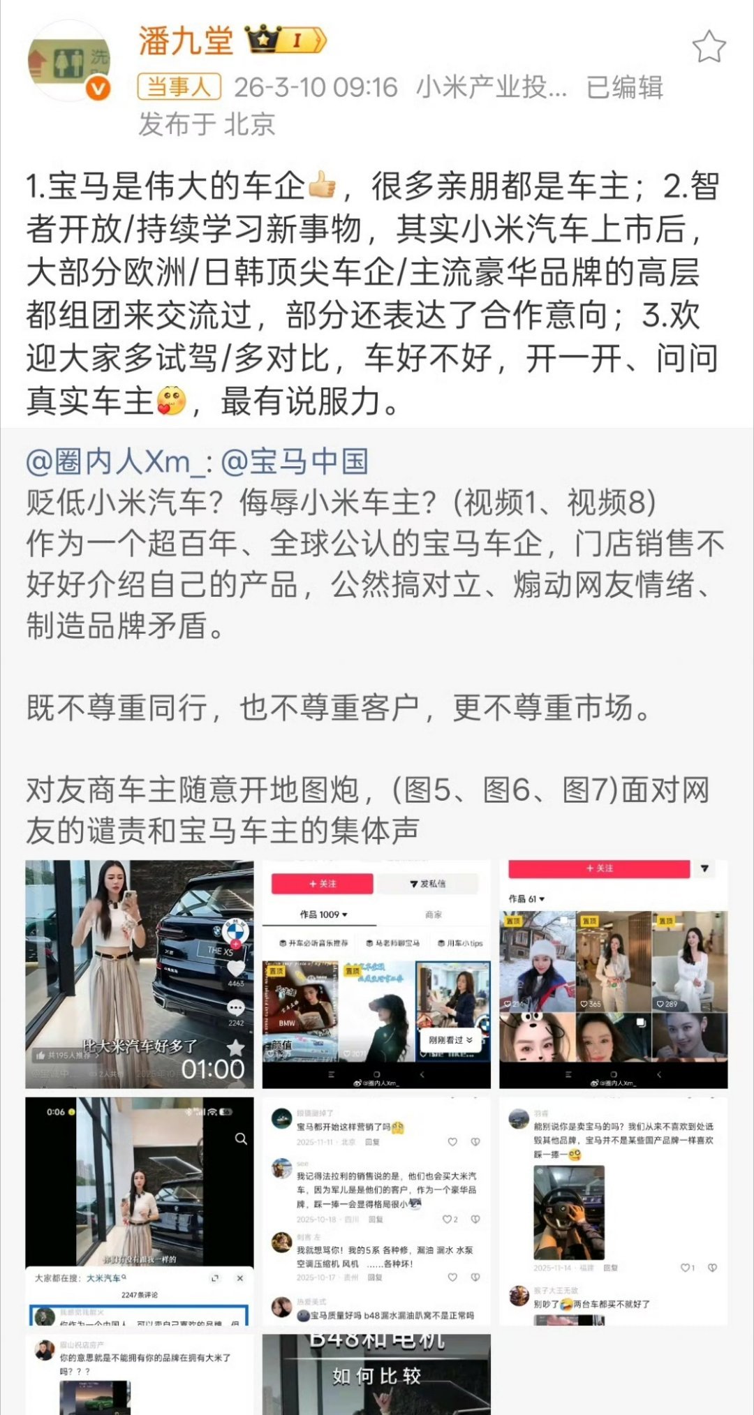 宝马主播贬低小米汽车这个事——我应该是这个新闻选题的最早发起者。。。3月8号下午3点,我偶尔刷到这个主播的视频,觉得很震惊。3月9号上午和业内朋友讨论。3月9号下午我录屏发了一条微博。3月10号凌晨24点40,有博主发布这个事件,当天上午9点,小米高管潘九堂转发该微博回应,随即上热搜。