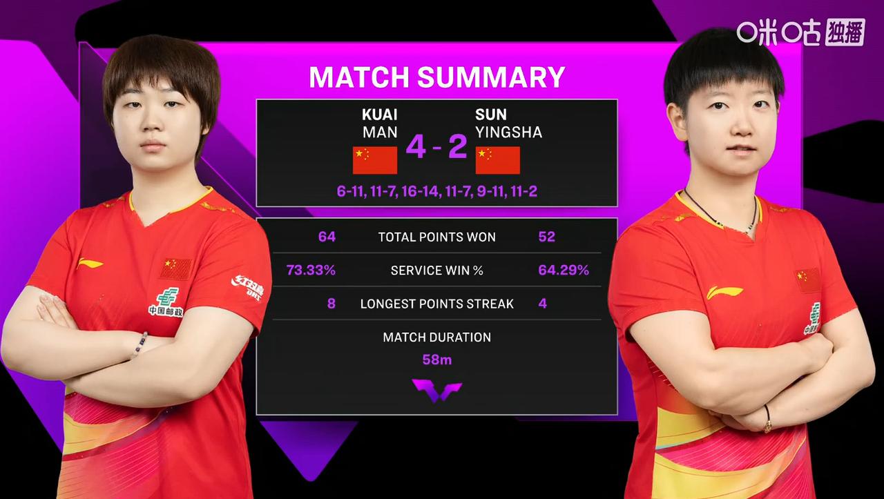 2026WTT重庆冠军赛四强争夺战,上午的四场比赛结果真是各种意料之外! 两场女单1/4决赛赛果: 王艺迪🇨🇳 4-3 申裕斌🇰🇷【11-7,11-5,11-6,10-12,7-11,6-11,11-2】 王艺迪和申裕斌的比赛,前面三局打的挺顺,中间三局又跟走神了一样,连丢三局,最后的决胜局又干脆利落的11-2拿下,也是挺玄幻的。 蒯曼🇨🇳 4-2 孙颖莎🇨🇳【6-11,11-7,16-14,11-7,9-11,11-2】 莎莎和蒯曼这场比赛,内战输赢也正常,蒯曼更想要,莎莎没咋强行调动自己,打出想要的球也不错! 上半区蒯曼和王艺迪晋级女单四强,半决赛又是一场国乒的内战,看谁能晋级决赛吧! 2026WTT重庆冠军赛-两场男单1/4决赛 赛果: 温瑞博🇨🇳 4-2 邱党🇩🇪【11-4,11-7,12-10,8-11,5-11,14-12】 国乒“莽夫”温瑞博这一站发挥都挺不错,过了小莫,今天又过了邱党! 张本智和🇯🇵 4-2 林昀儒(中国台北)【11-8,5-11,11-9,2-11,11-7,11-6】 林昀儒今天这场比赛还是挺可惜的,没有咬下来。 下一轮半决赛对阵:温瑞博🇨🇳 VS 张本智和🇯🇵,小温加油! 晚间场4四场比赛: 18:30 T1 陈熠 VS 大藤沙月 19:15 T1 王楚钦 VS 松岛辉空 20:00 T1 石洵瑶 VS 张本美和 20:45 T1 雨果 VS F.勒布伦 国乒加油吧,争取顺利会师决赛吧![奋斗][奋斗][奋斗]